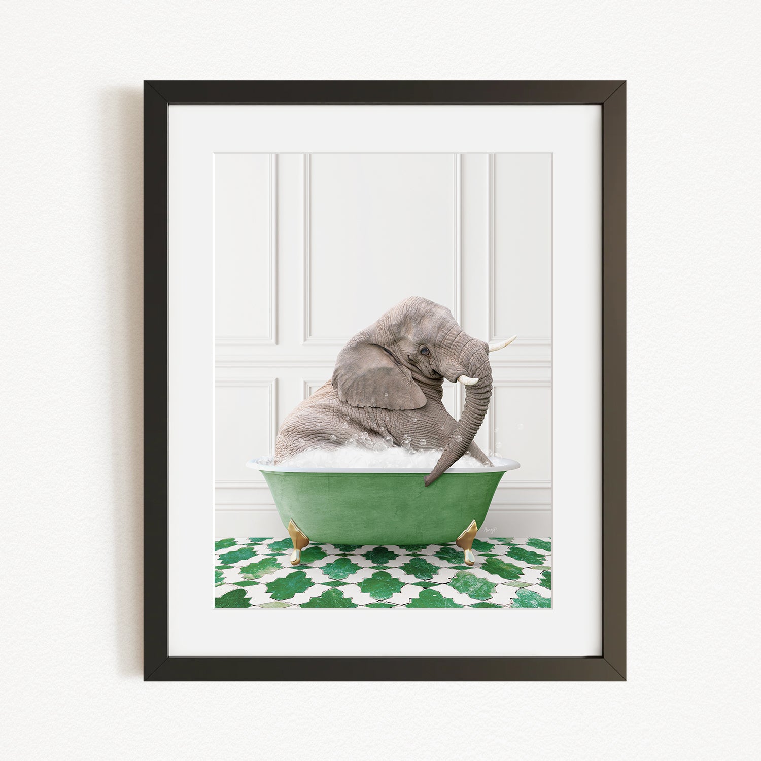 Young Elephant in Eclectic Green Panel Wall Bath