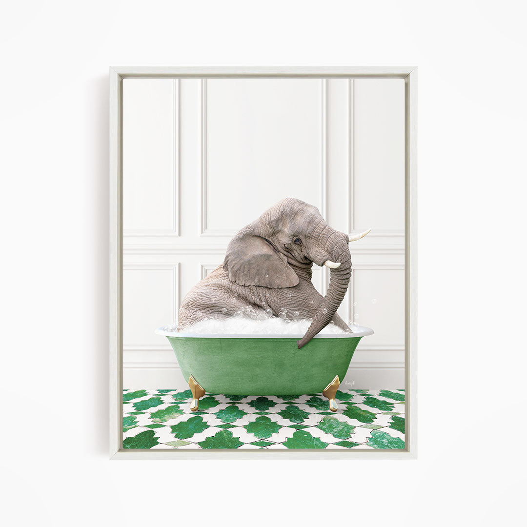A gray elephant is sitting in a green bathtub filled with bubbles, surrounded by a green and white patterned floor.