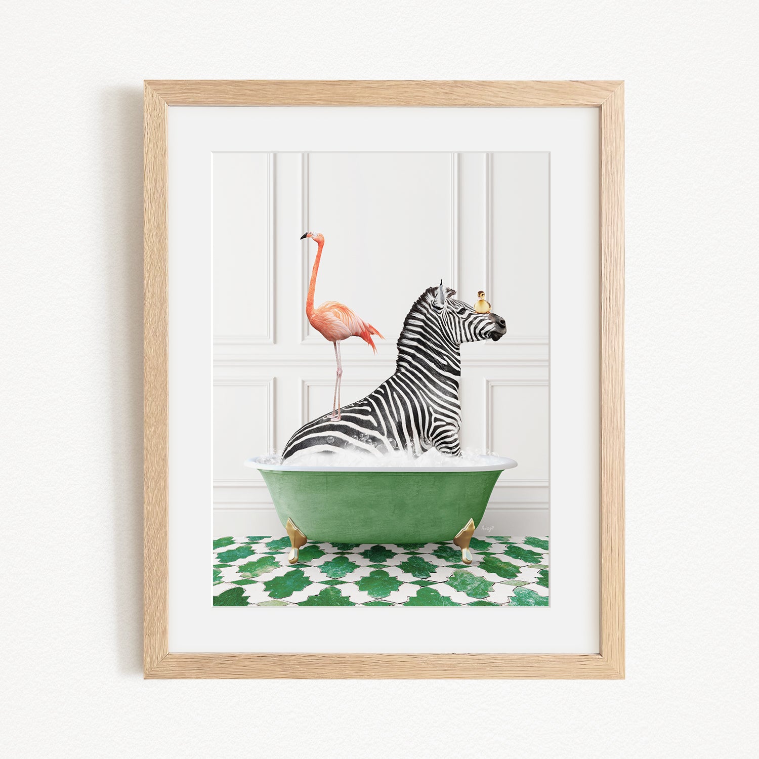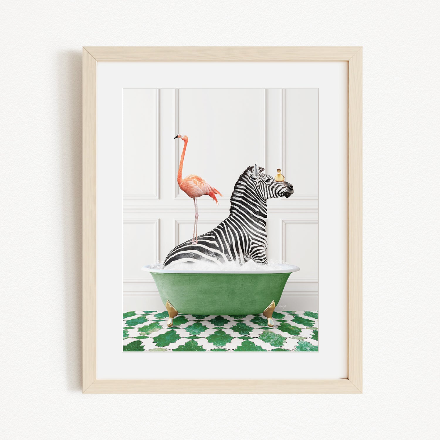 A framed image depicting a zebra sitting in a green bathtub, with a flamingo standing on its back and a bird perched on its head.