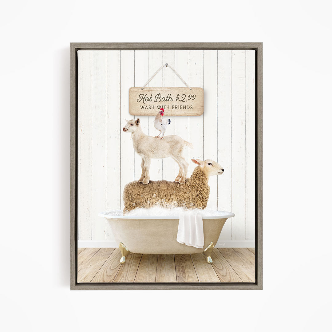 A framed image depicting a goat standing on top of a sheep in a bathtub, with a sign above that reads "Hot Bath $2.00 WASH WITH FRIENDS".