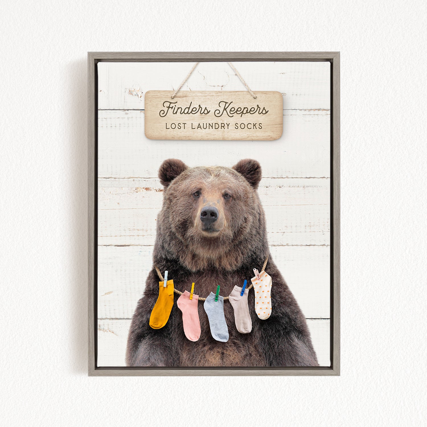 A framed image of a brown bear wearing colorful socks hanging on a clothesline, with a sign above that reads "Finders Keepers Lost Laundry Socks".