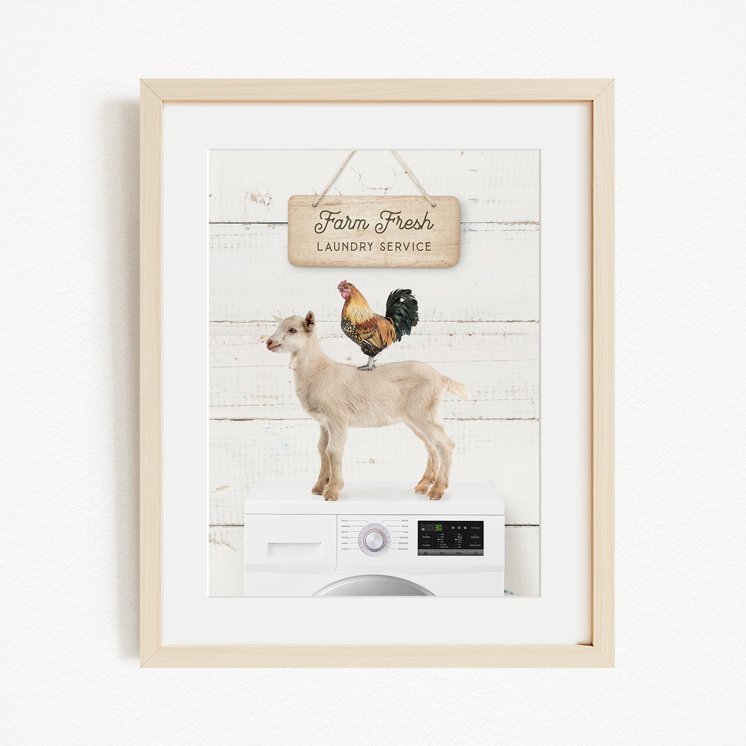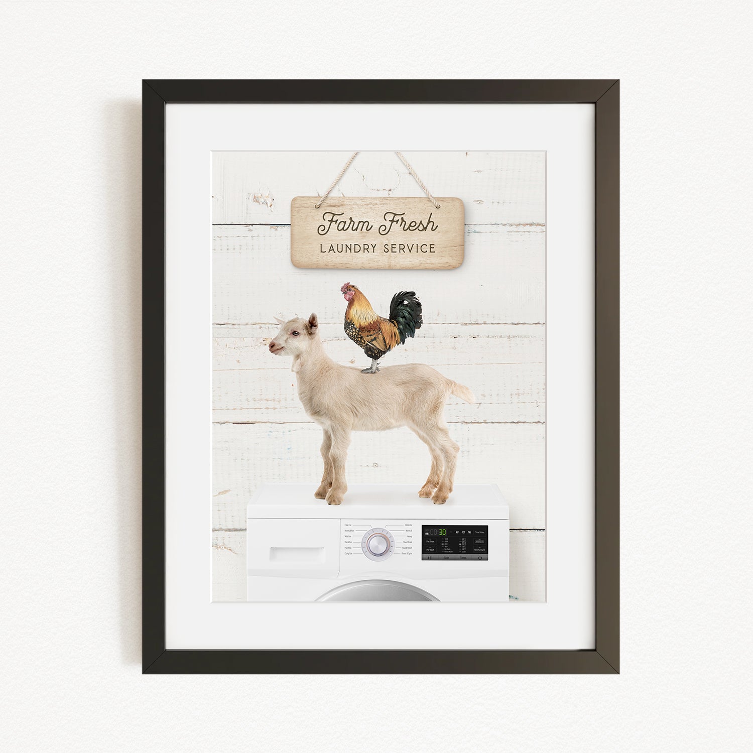 a goat standing on top of a washing machine, with a rooster perched on its back. The scene is set against a white background with a wooden sign that reads "Farm Fresh Laundry Service".