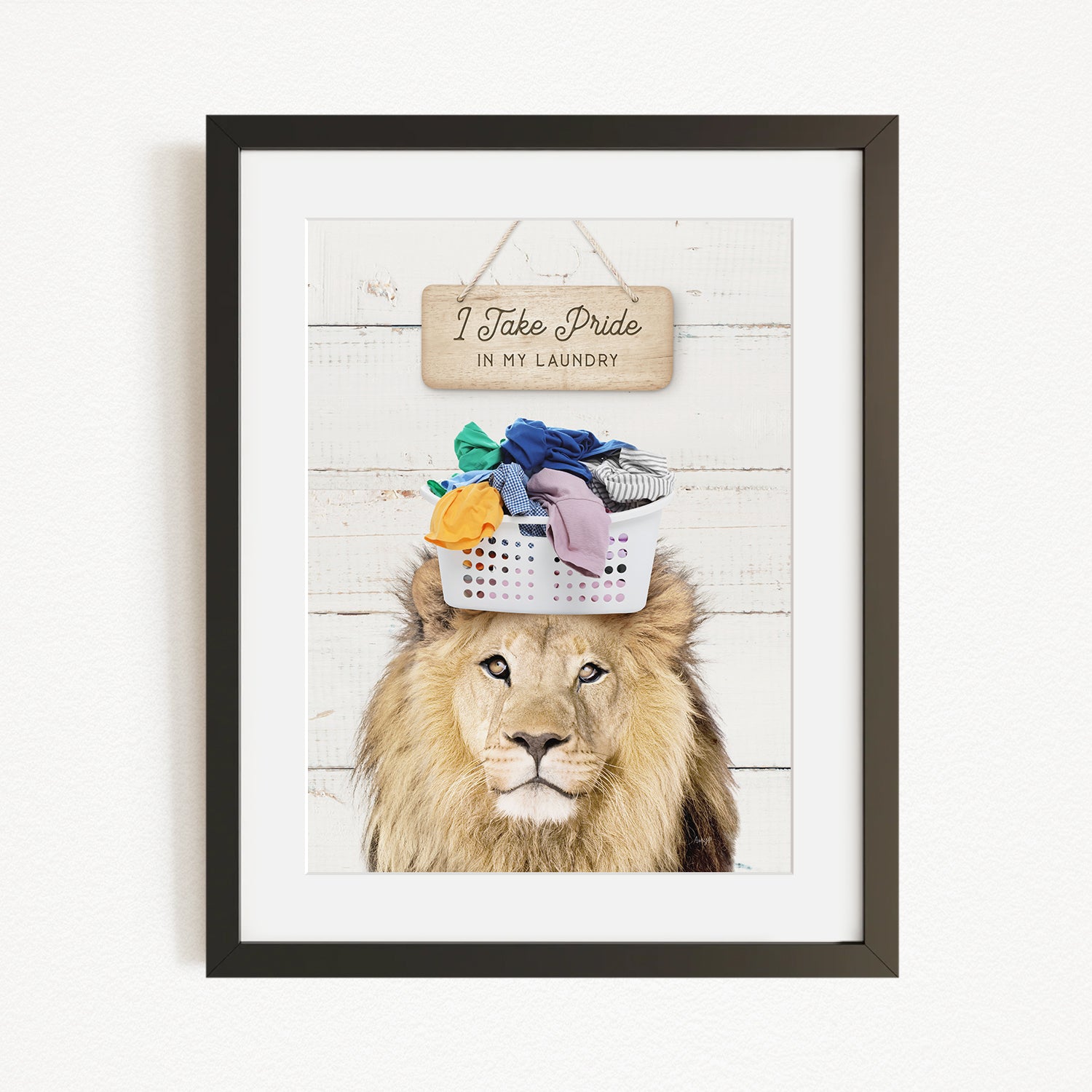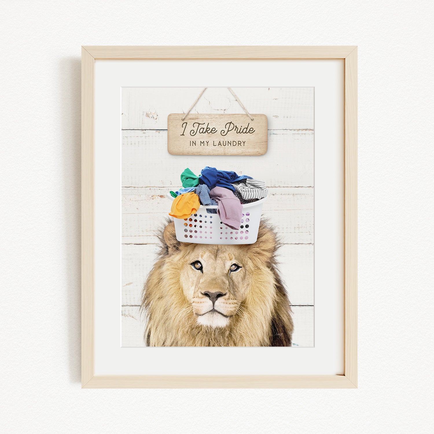 A framed image of a lion with a basket of laundry on its head, accompanied by a wooden sign that reads "I Take Pride in my Laundry".