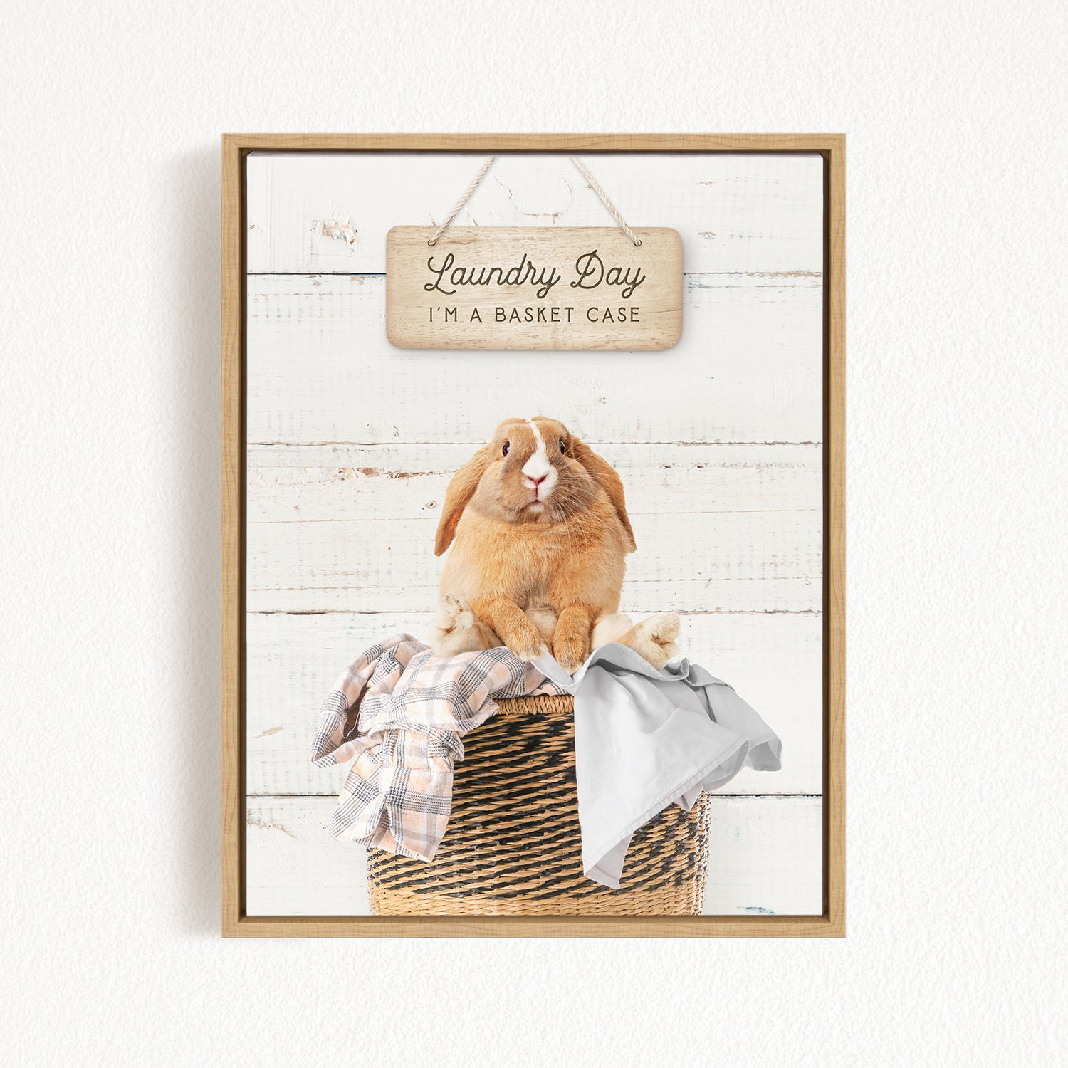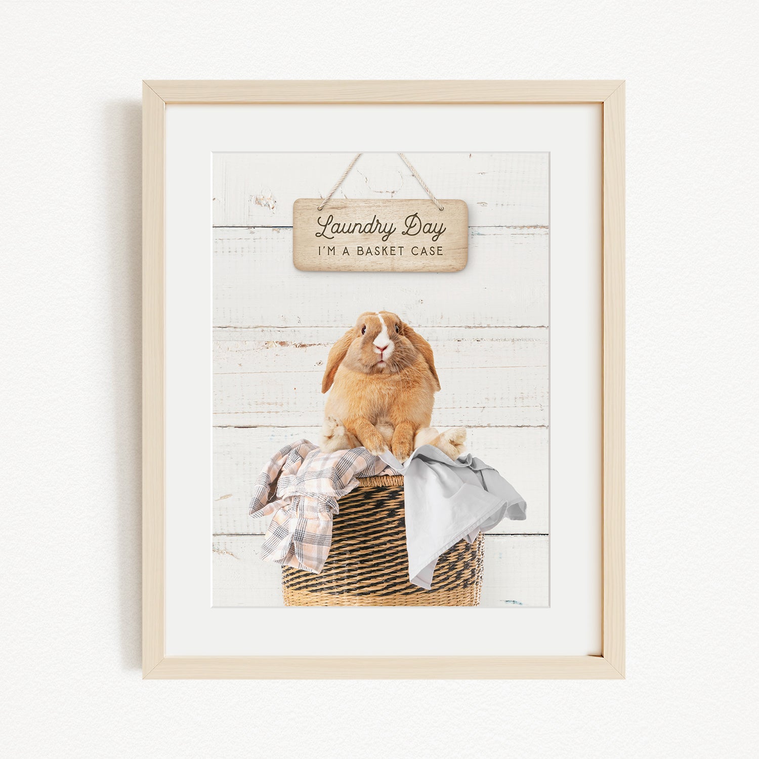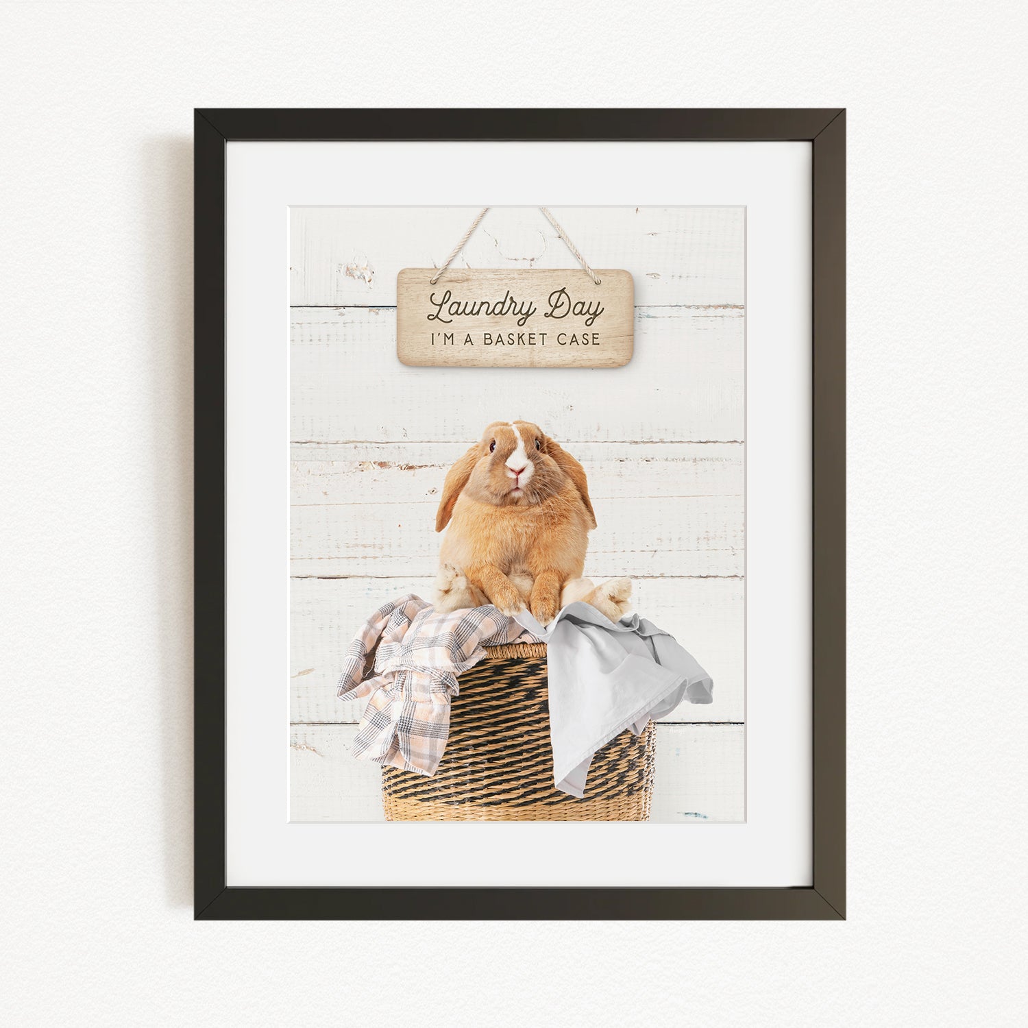 A framed image of a rabbit sitting in a basket filled with clothes, with a sign above it that says "Laundry Day I'm a basket case".