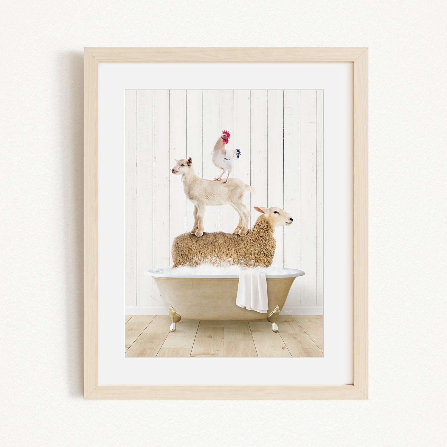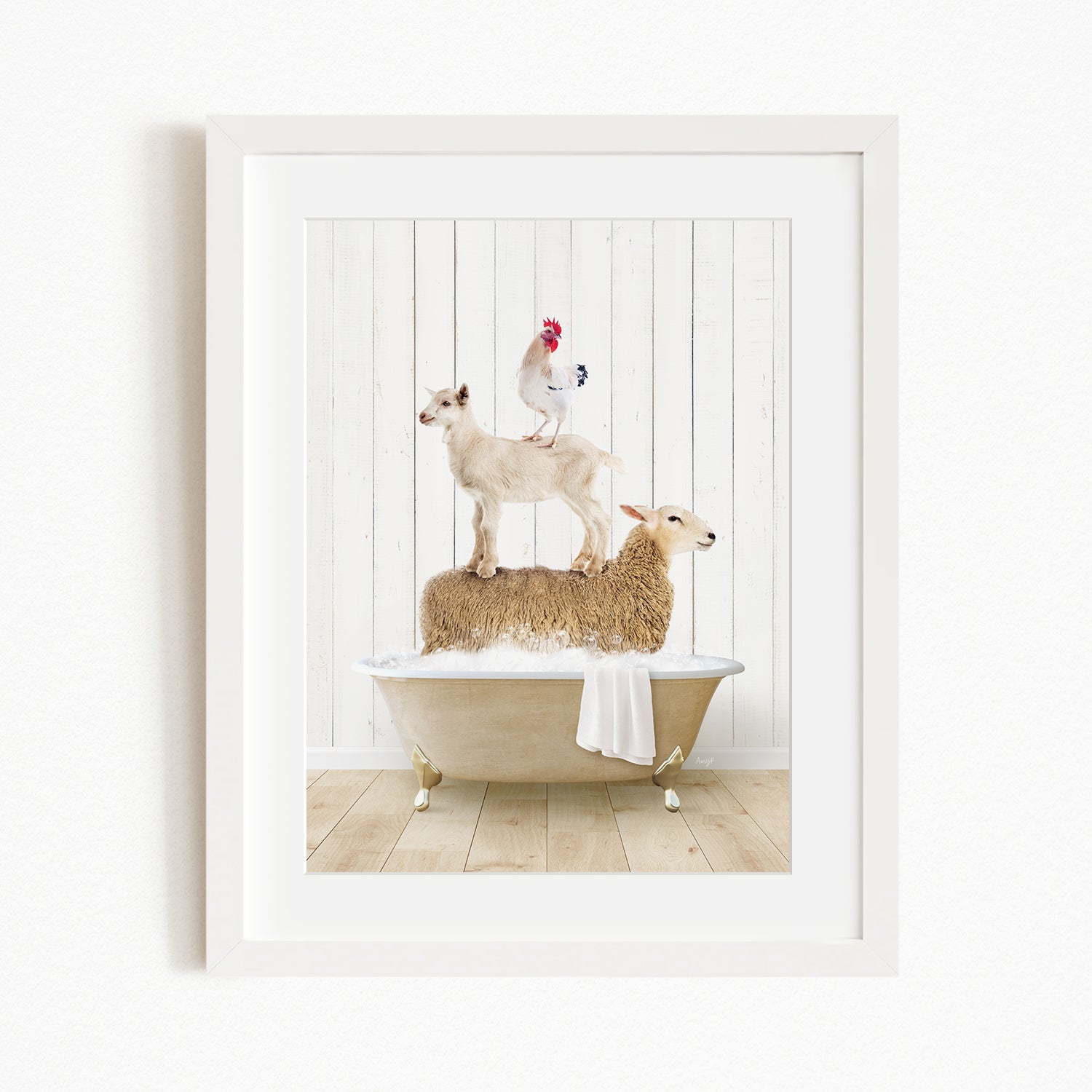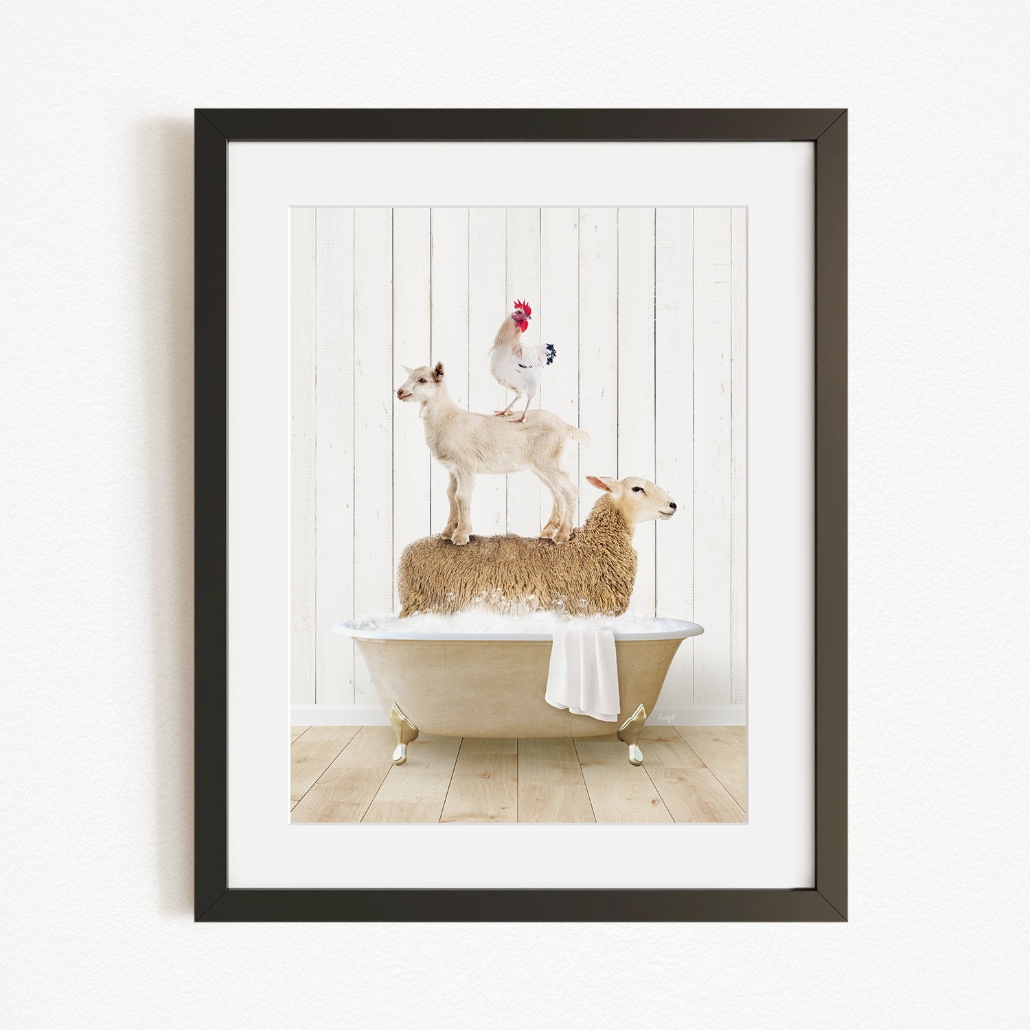 A framed image depicting a goat standing on a sheep's back while a chicken sits on top of the sheep, all in a bathtub.