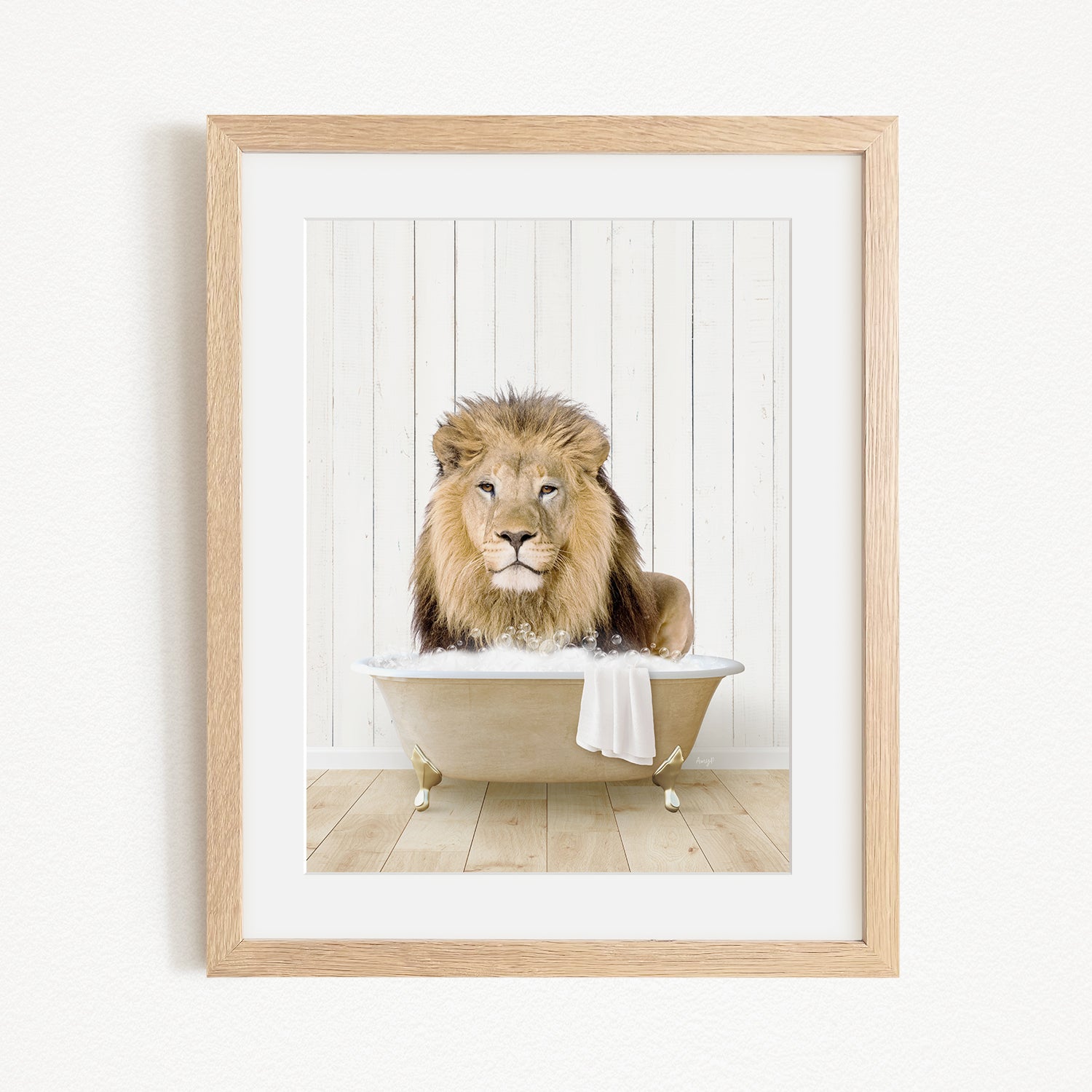 A lion sitting in a bathtub filled with water, with a towel draped over the side of the tub.