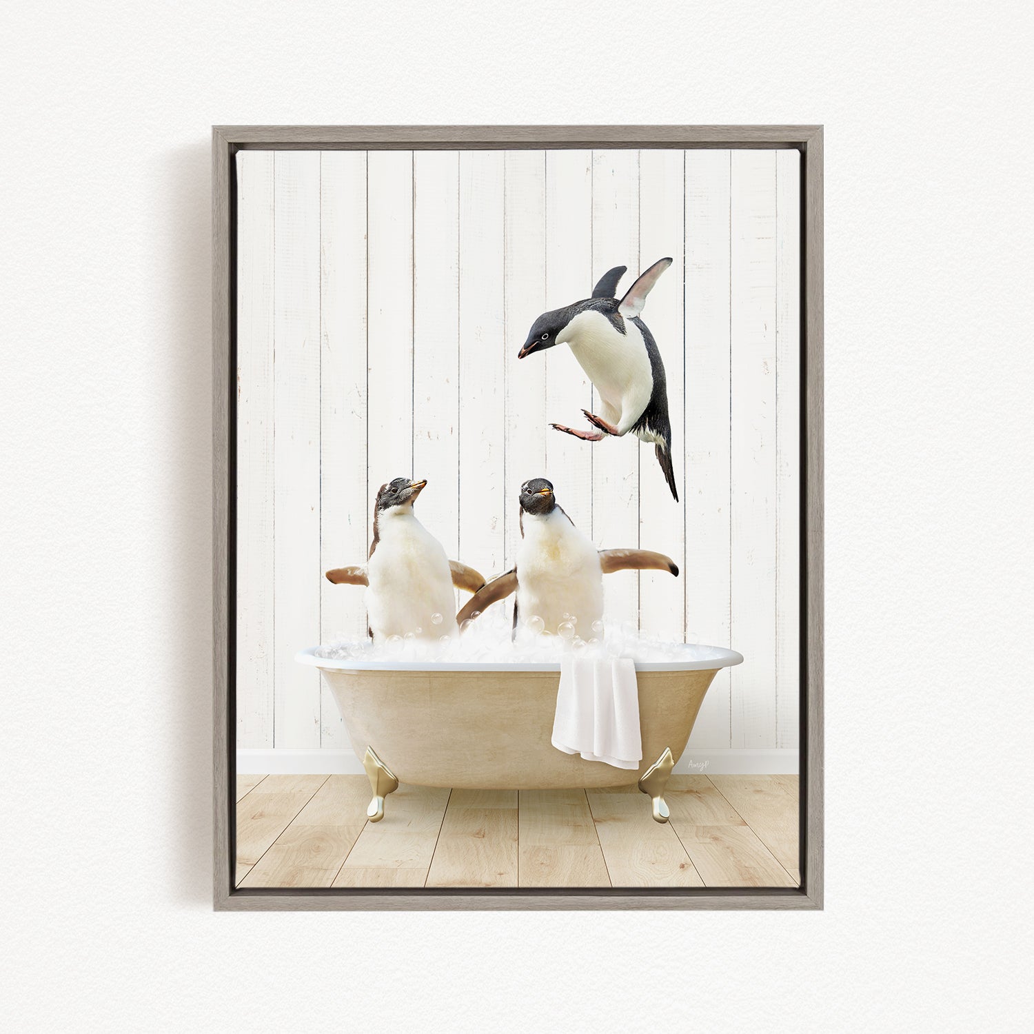 A framed image depicting three penguins sitting in a bathtub, with one penguin flying towards the others.