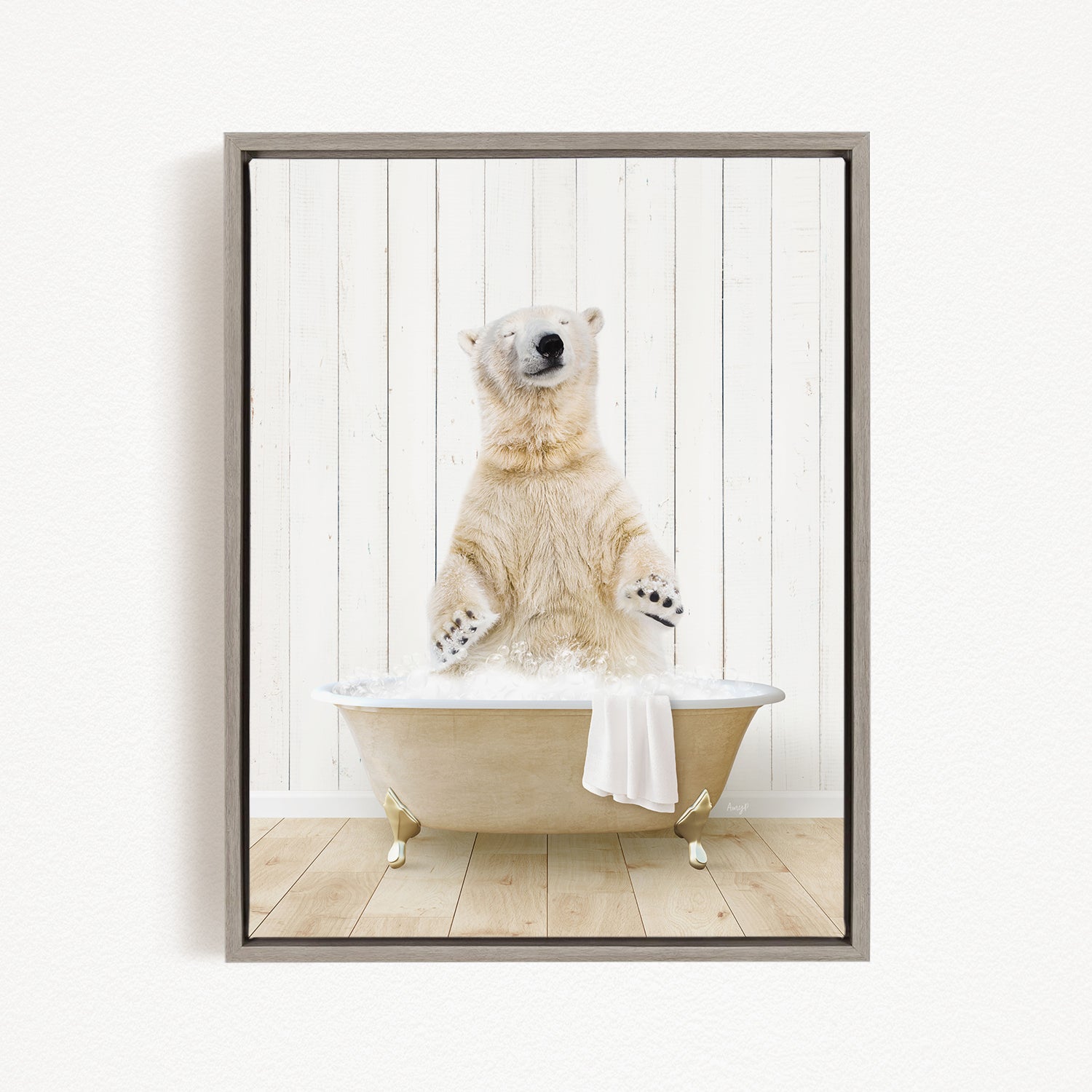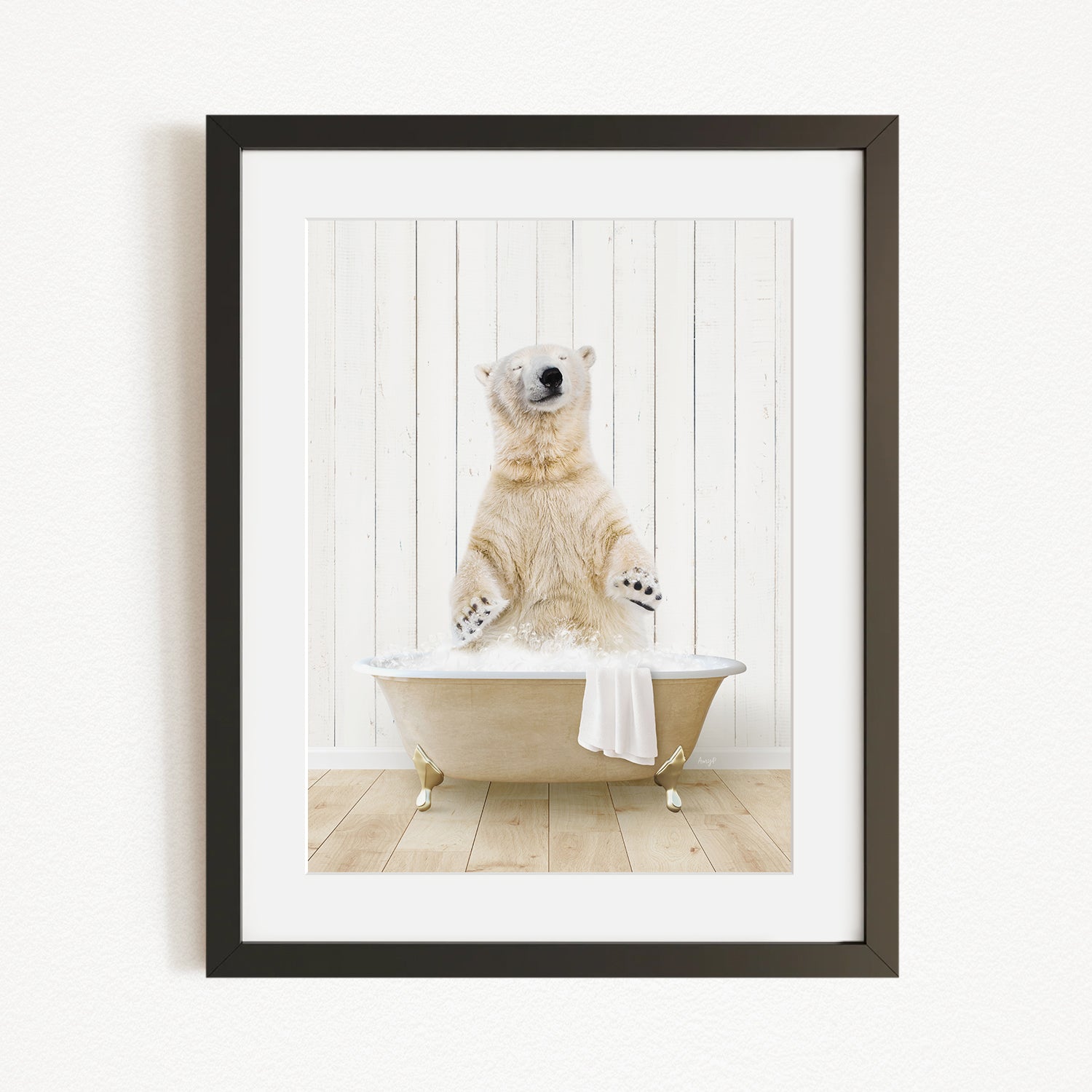 A polar bear standing in a bathtub filled with water, with its paws raised in the air.