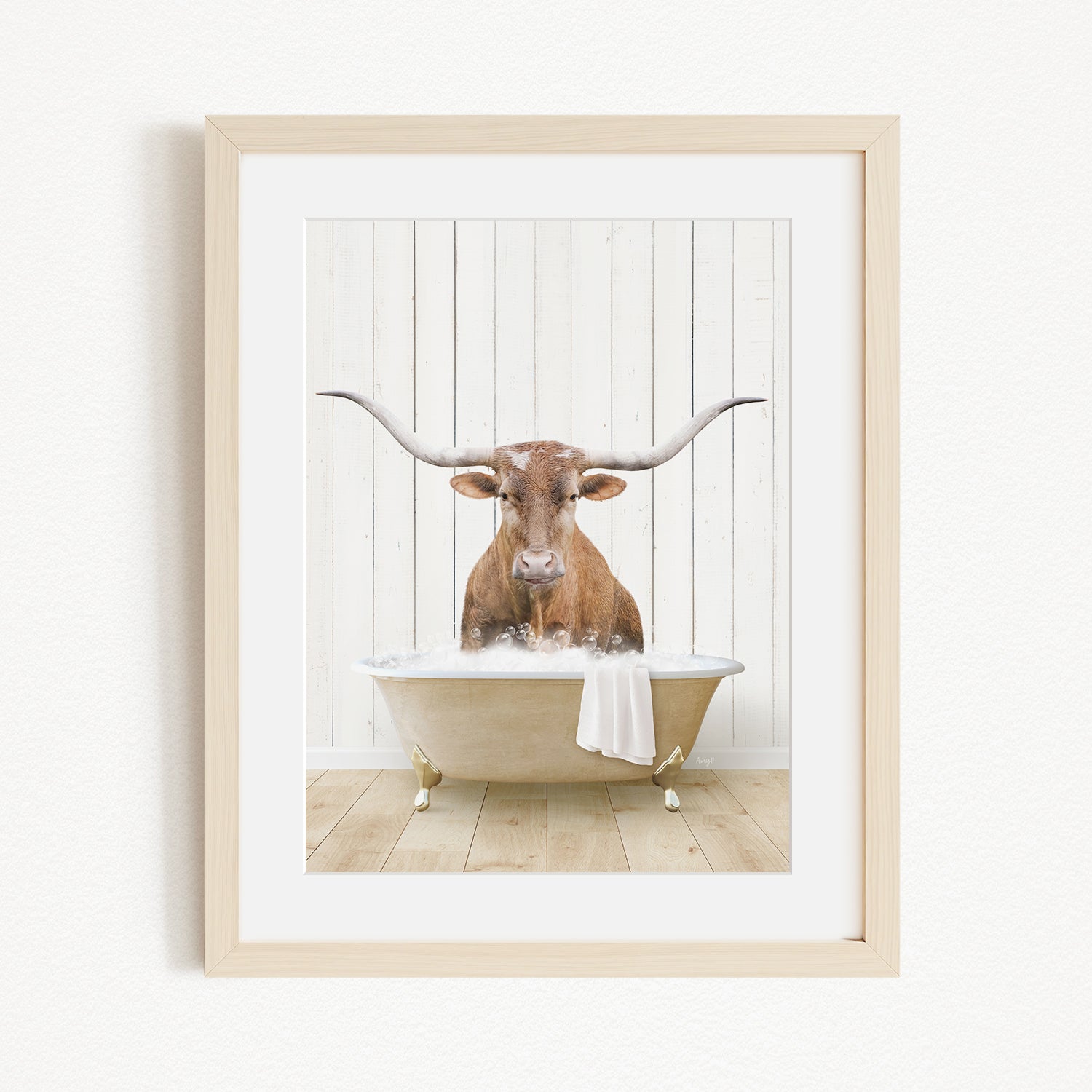A framed image depicting a brown cow with large horns sitting in a white bathtub filled with water.