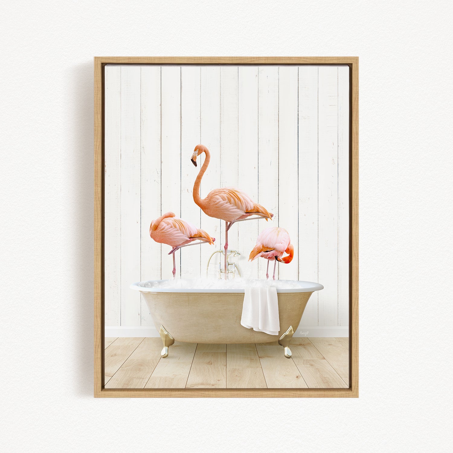 A framed image depicting three pink flamingos standing in a white bathtub filled with water, creating a whimsical and playful scene.