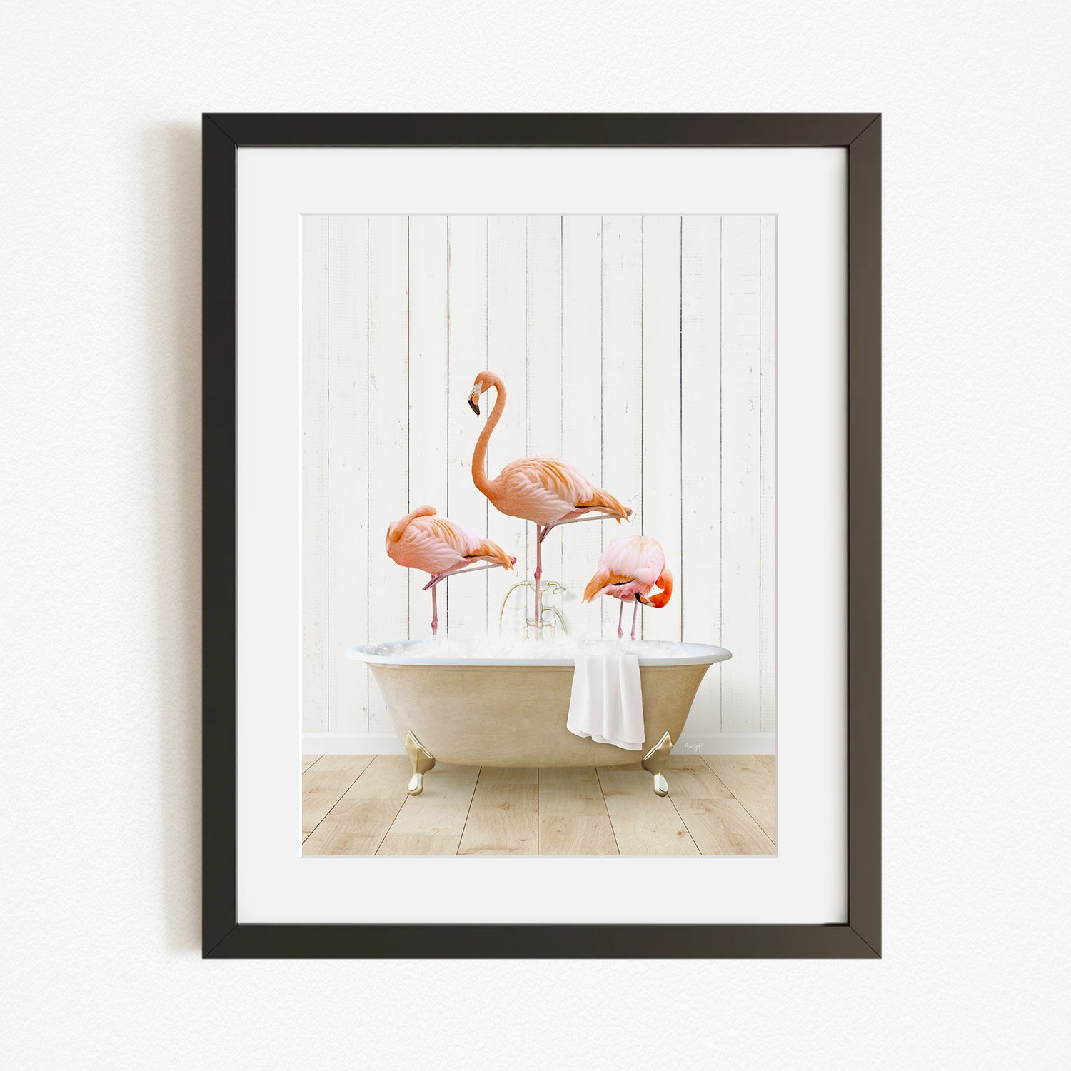 A framed image depicting three flamingos standing in a bathtub, with a white wooden wall in the background.