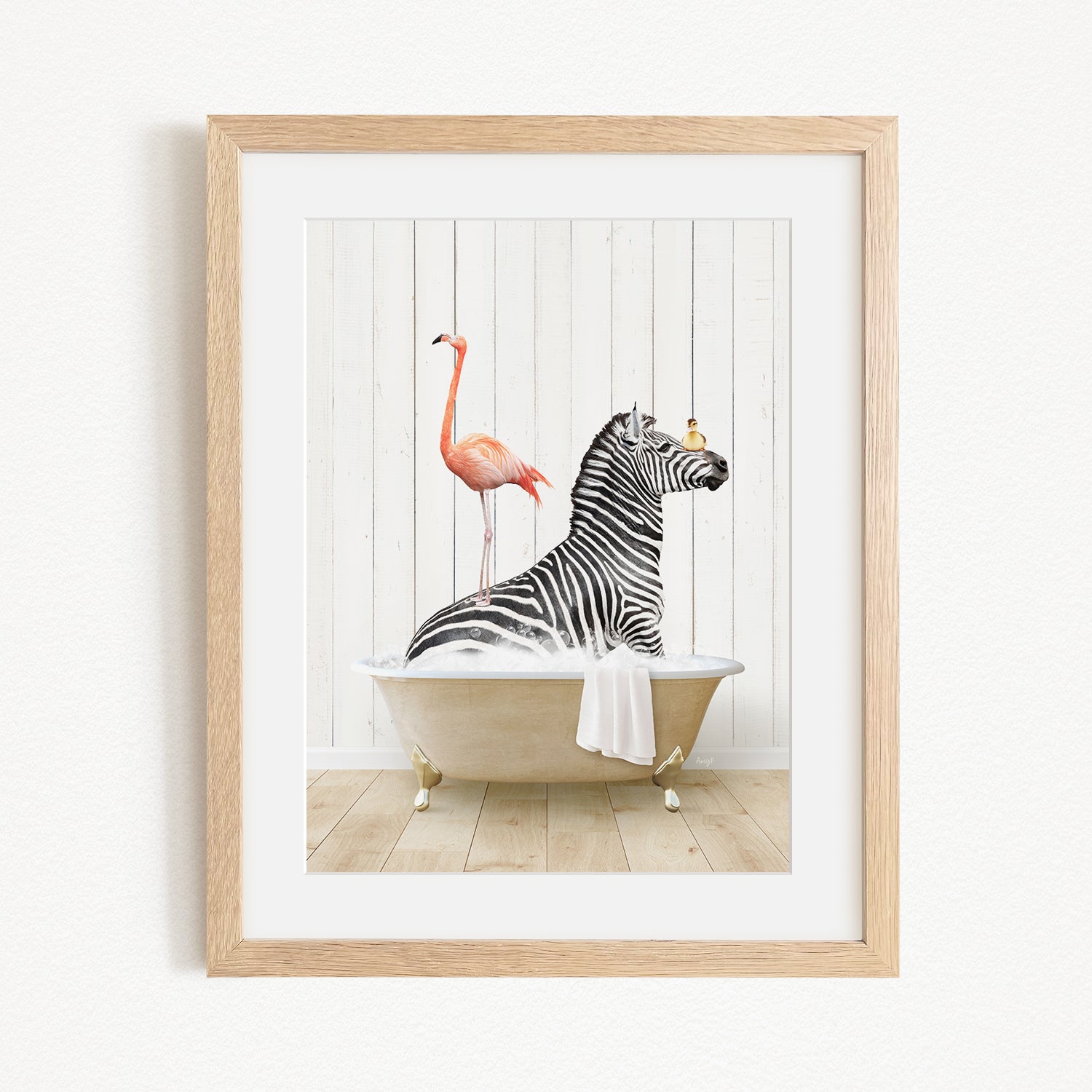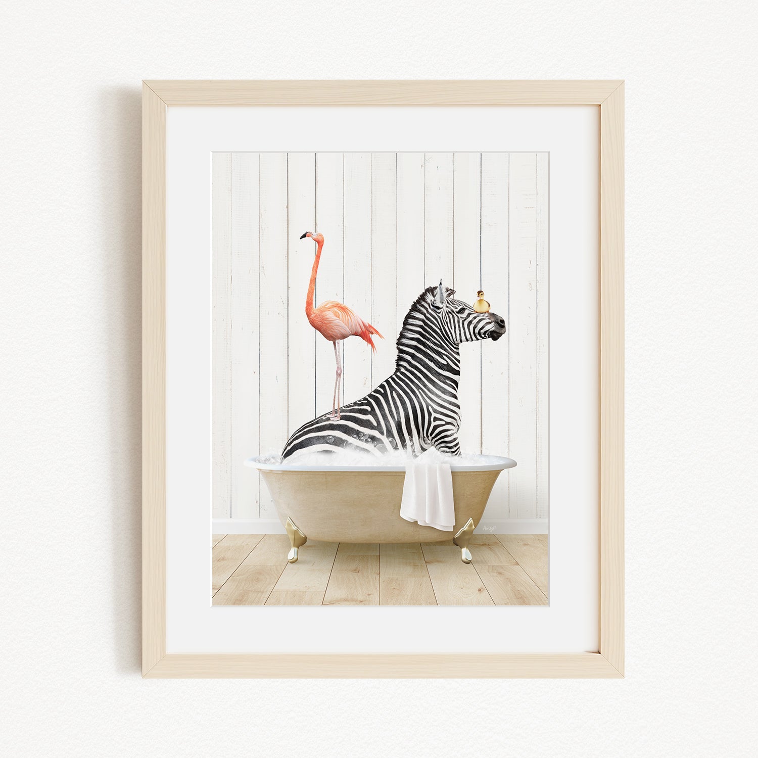 A framed image depicting a zebra sitting in a bathtub, with a flamingo standing on its back and a bird perched on its head.
