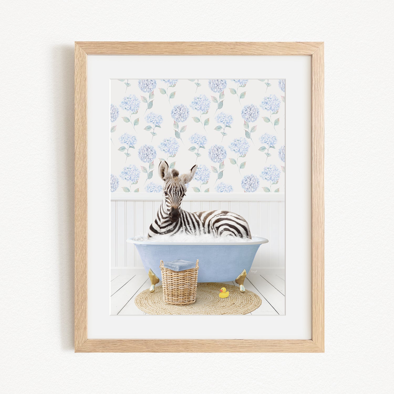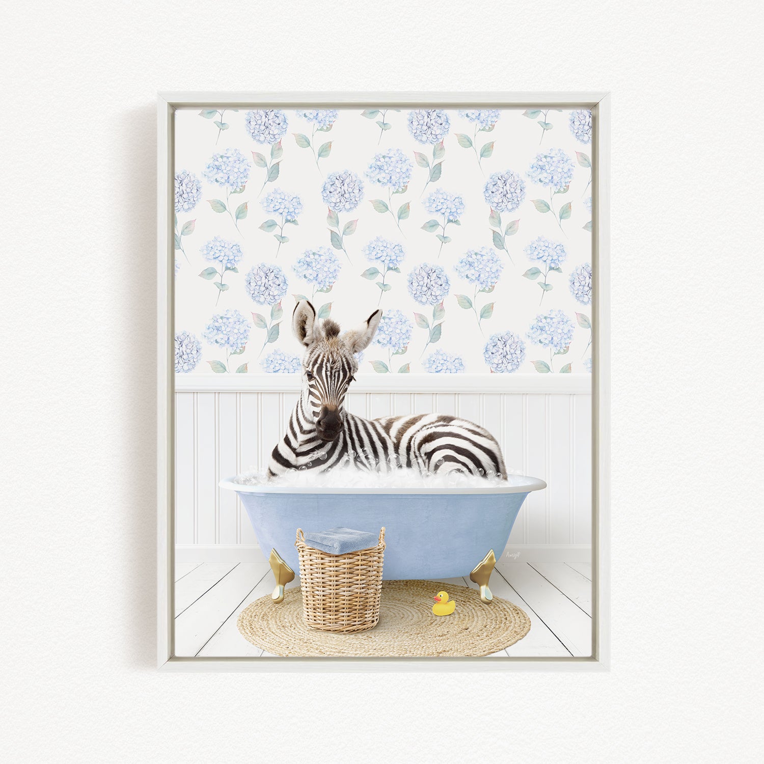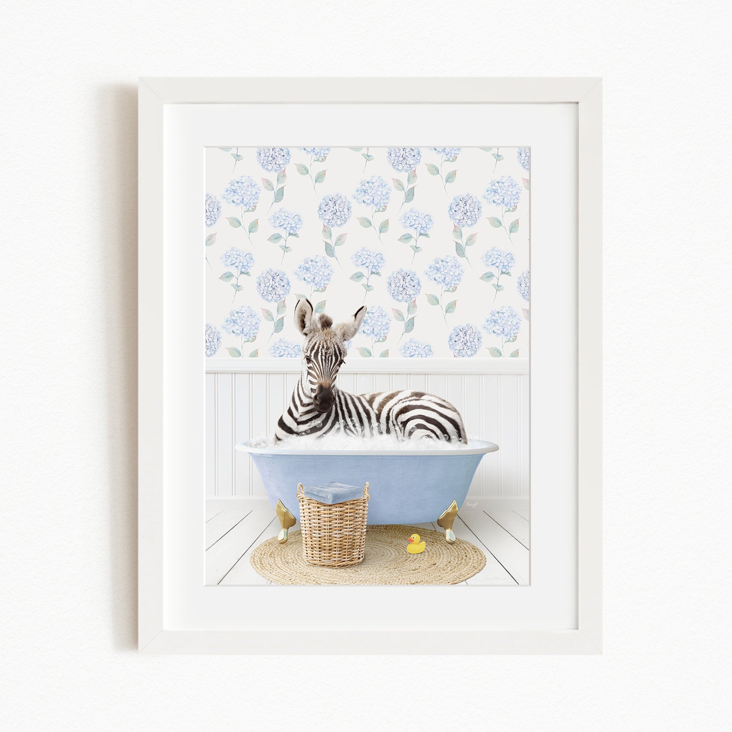 A zebra is sitting in a blue bathtub filled with water, surrounded by a wicker basket and a rubber duck.