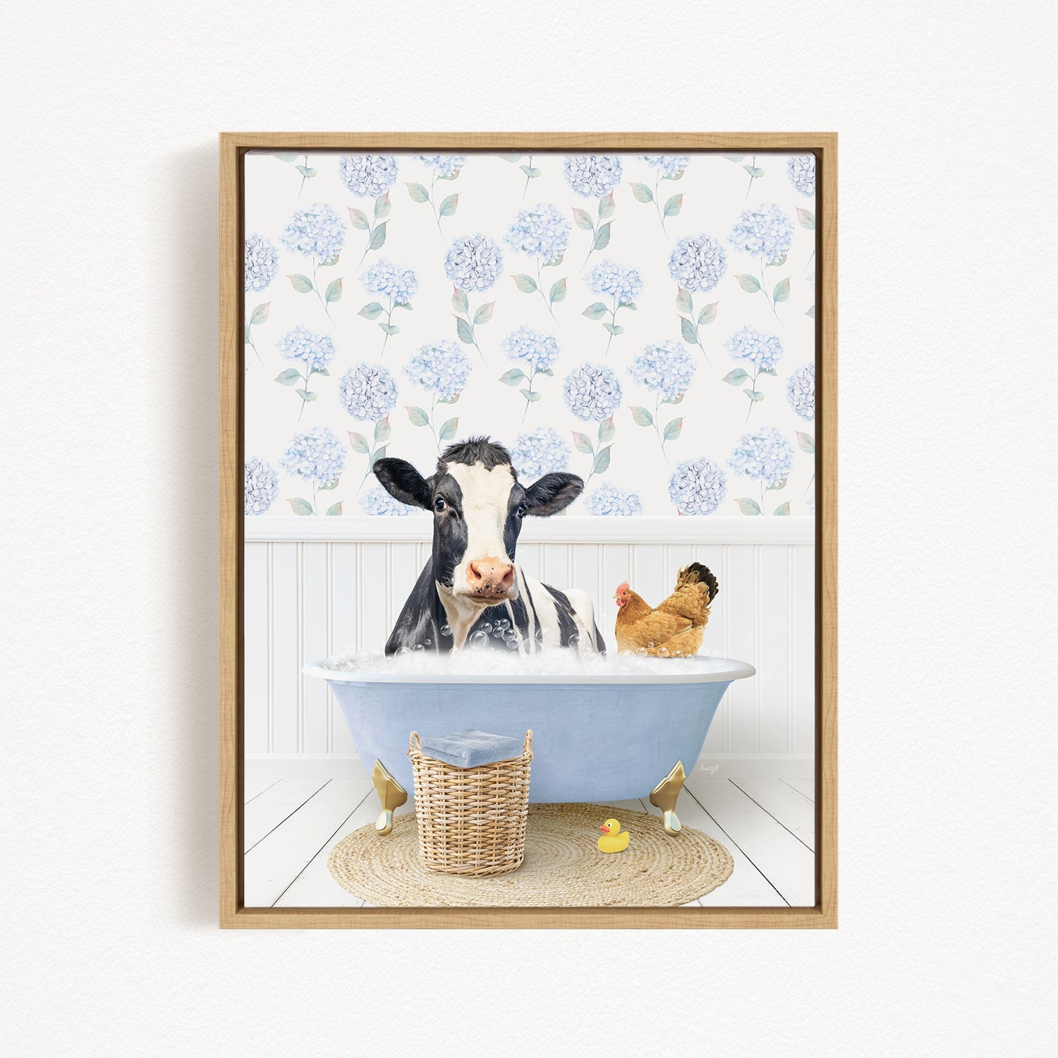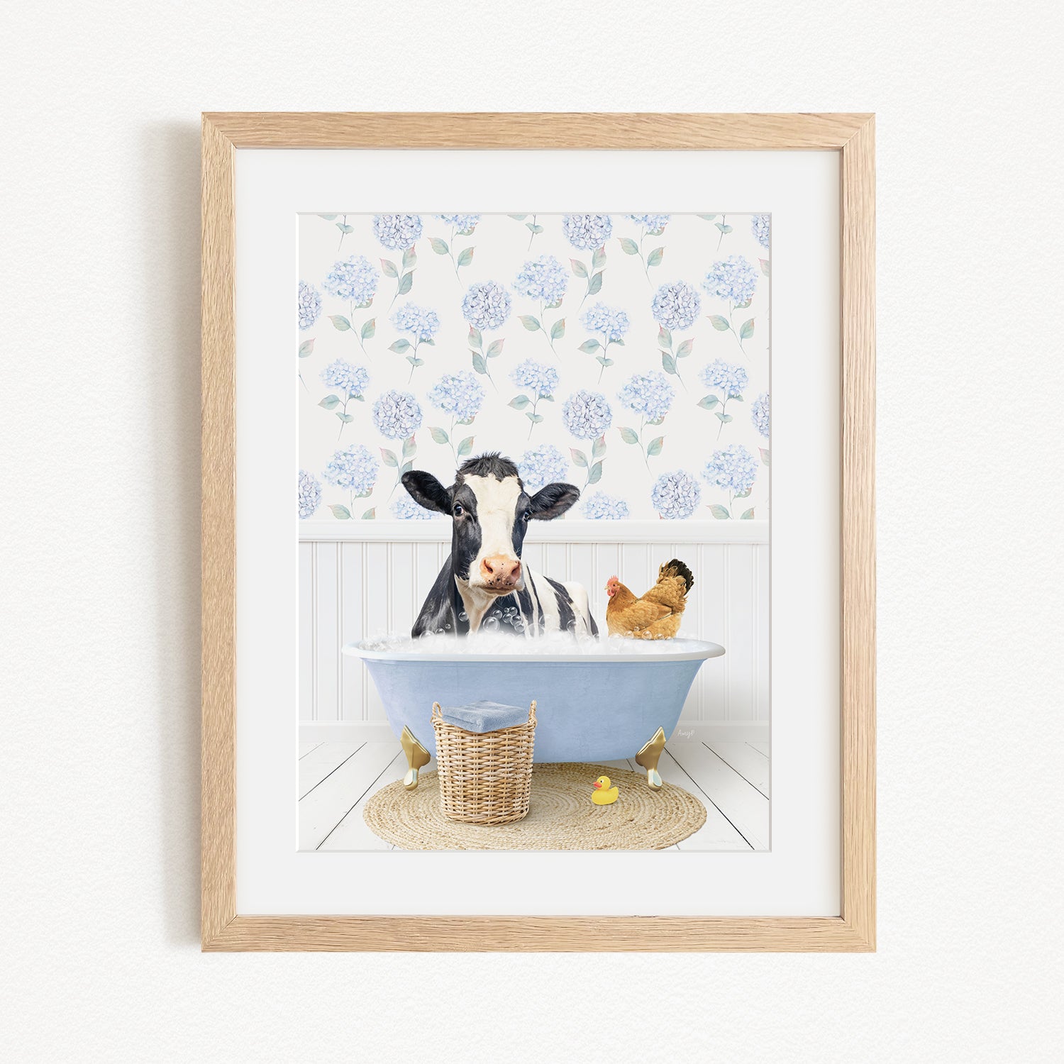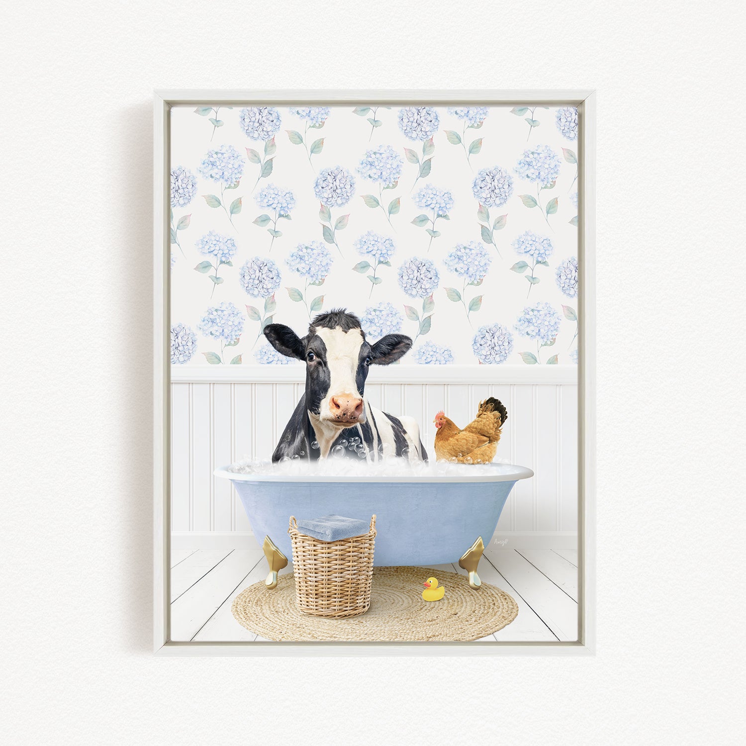 A framed image depicting a cow sitting in a bathtub, surrounded by a chicken and a duck, with a blue floral patterned wall in the background.