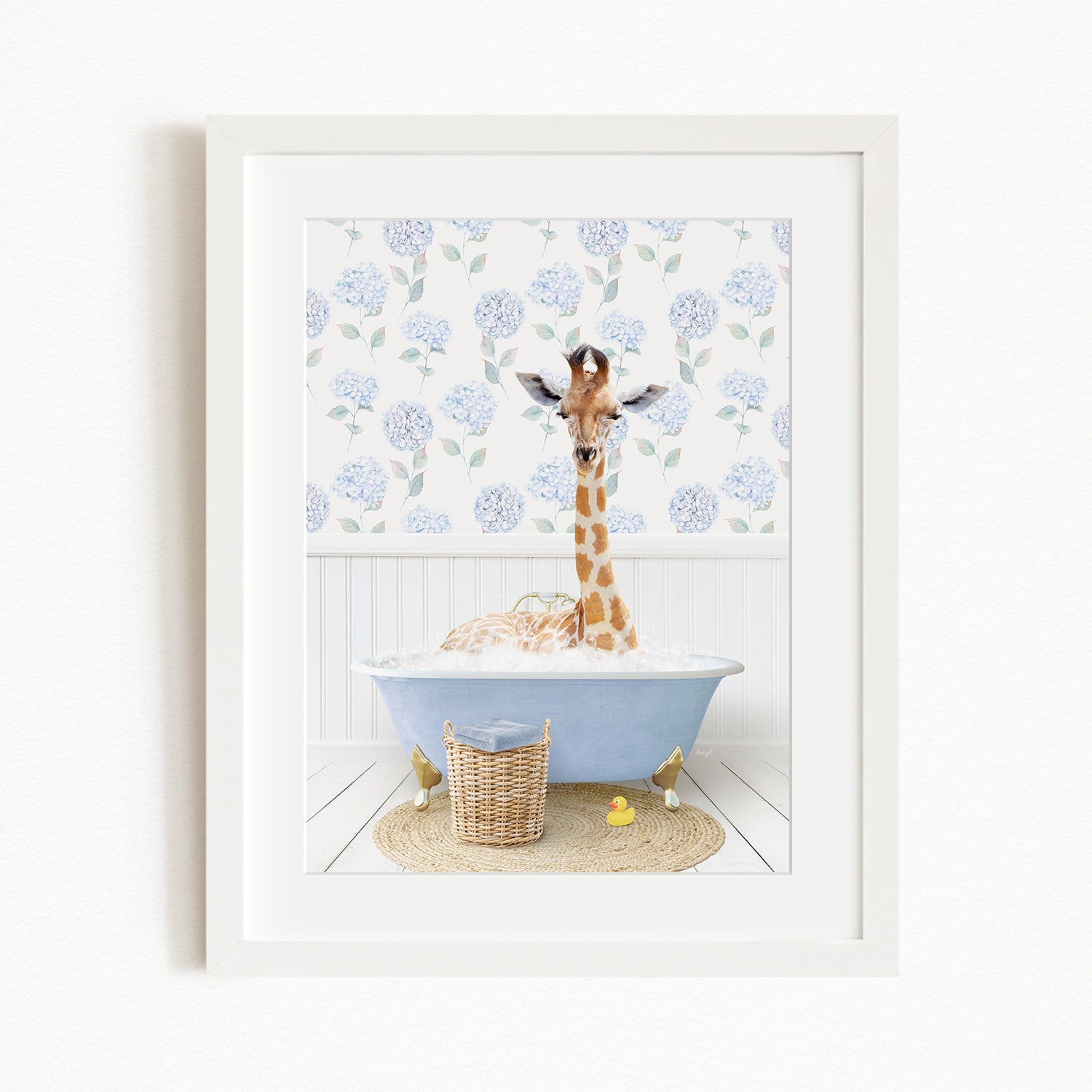A giraffe sitting in a blue bathtub filled with bubbles, surrounded by a white floral patterned wall and a basket of rubber ducks.