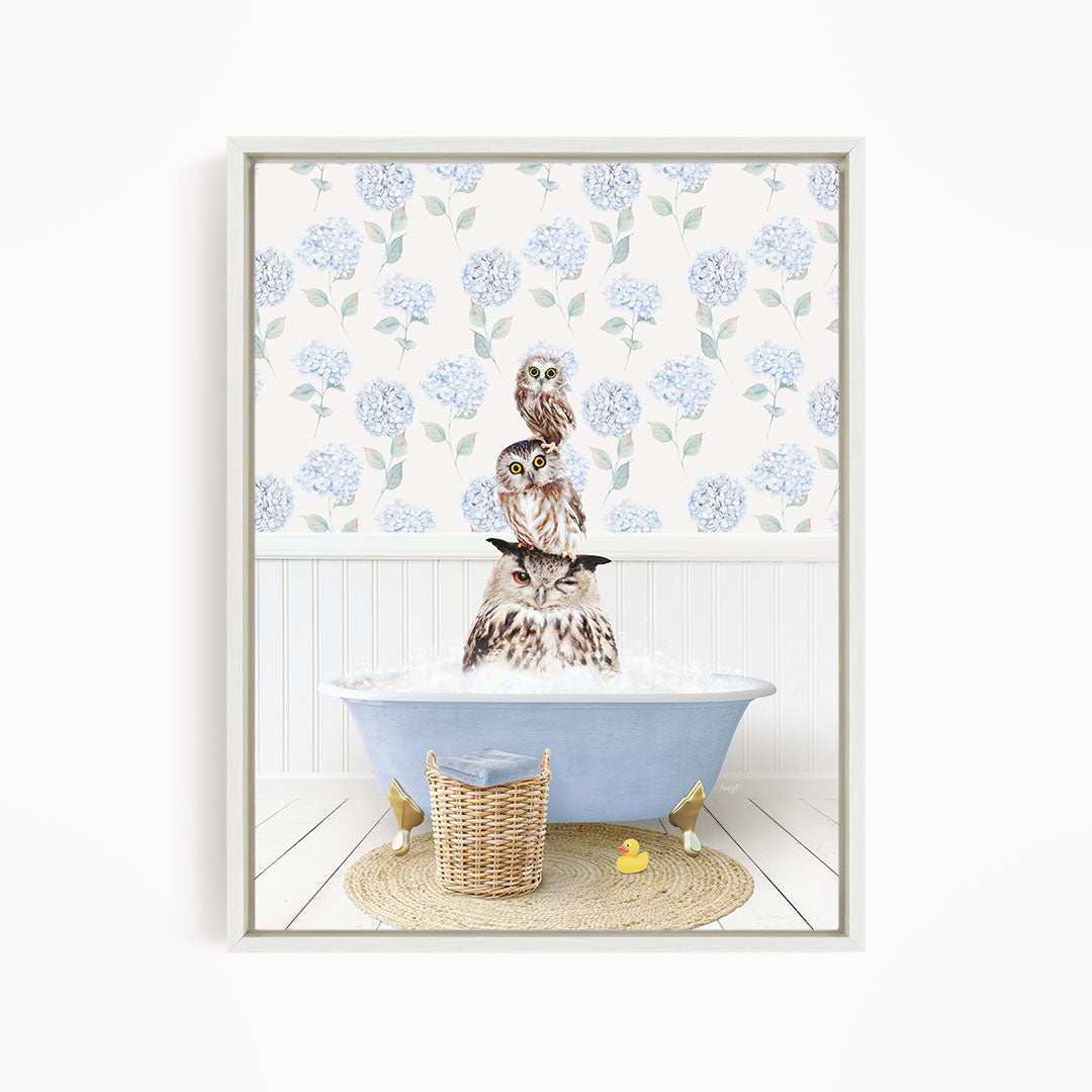 A framed image depicting three owls sitting in a bathtub filled with bubbles, surrounded by a blue floral pattern on the wall.