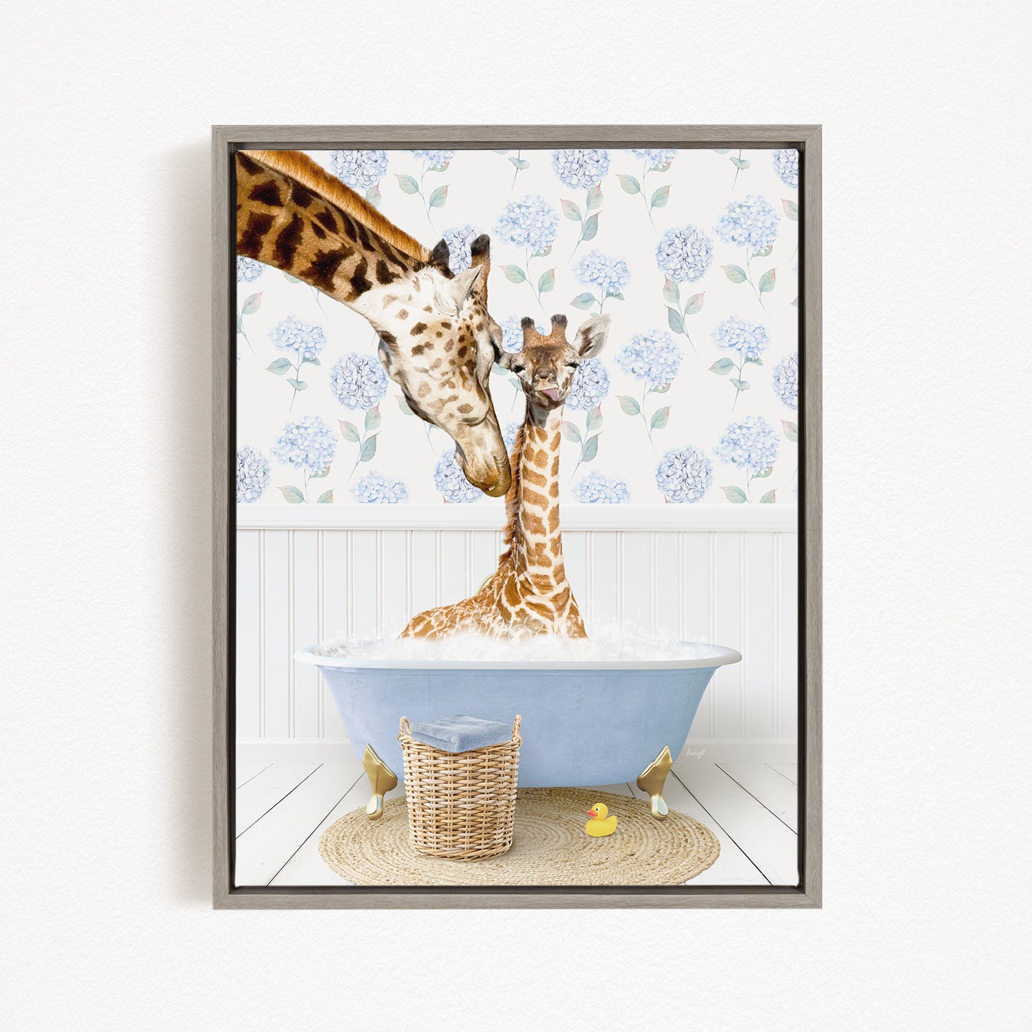 A giraffe and a baby giraffe are sitting in a blue bathtub filled with water, surrounded by a floral patterned wall and a basket of rubber ducks.