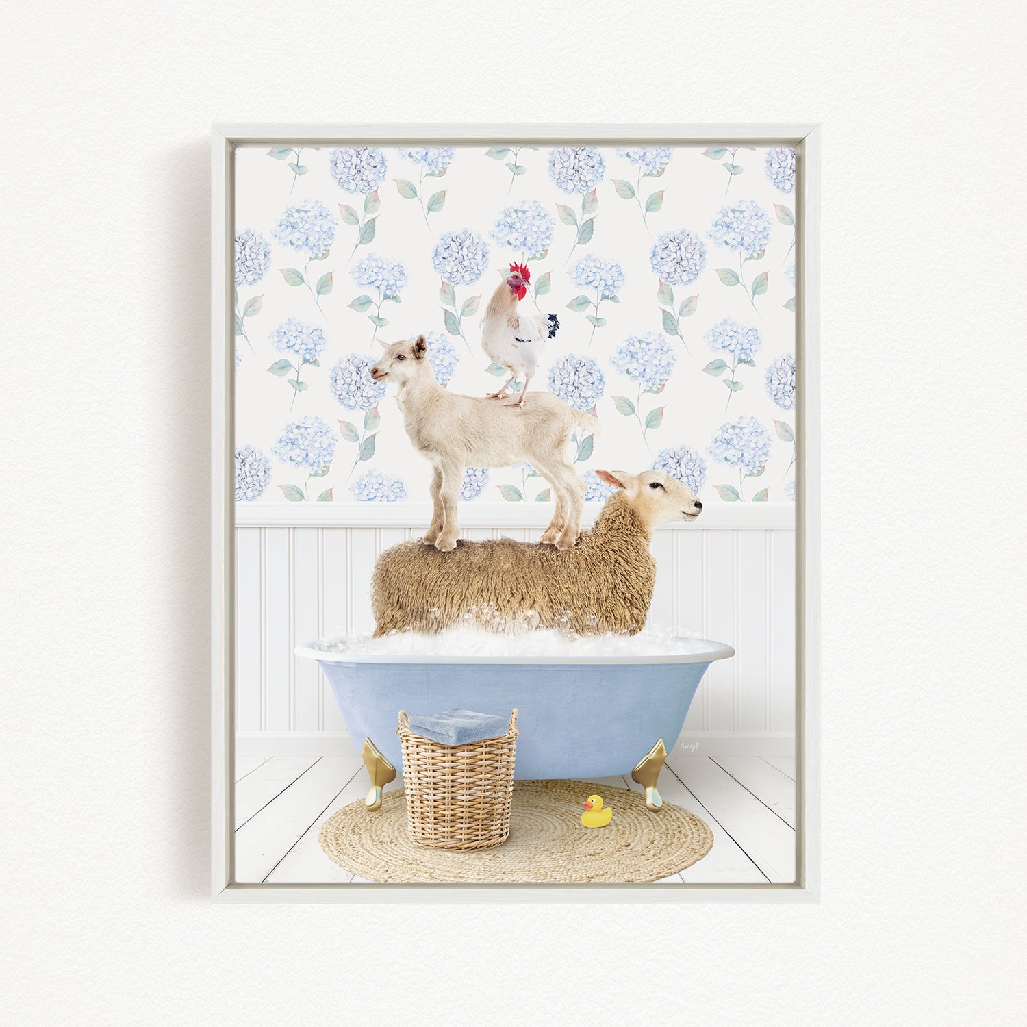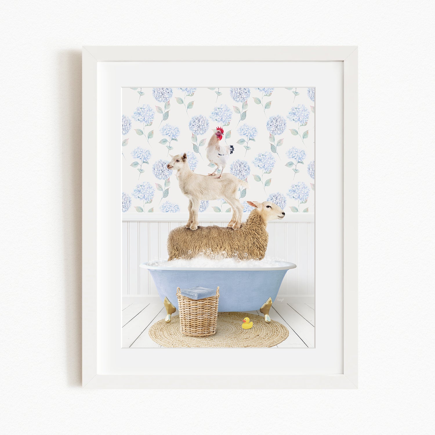 A framed image depicting a sheep standing in a bathtub, with a chicken perched on its back, and a yellow rubber duck floating in the water.