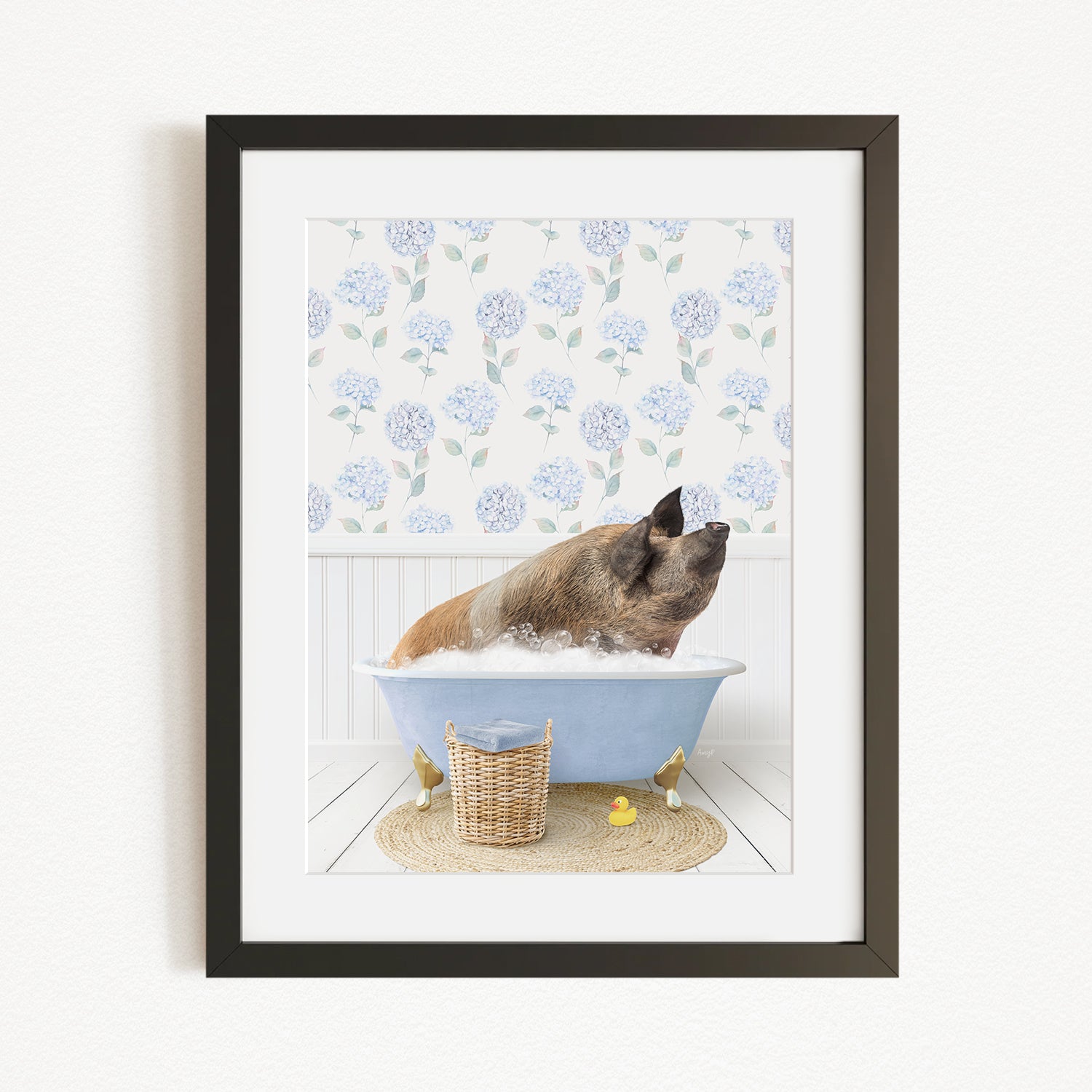 A brown pig sitting in a blue bathtub filled with bubbles, surrounded by a white floral pattern on the wall behind it.