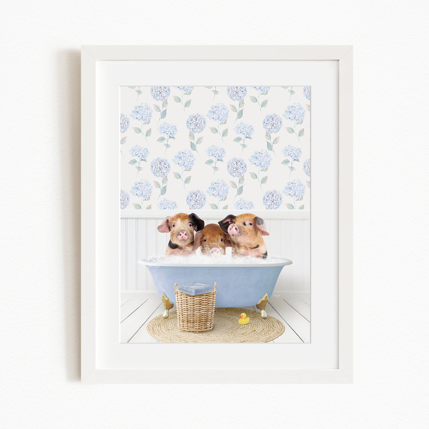 Three adorable pigs sitting in a blue bathtub, surrounded by a floral patterned wall and a yellow rubber duck.