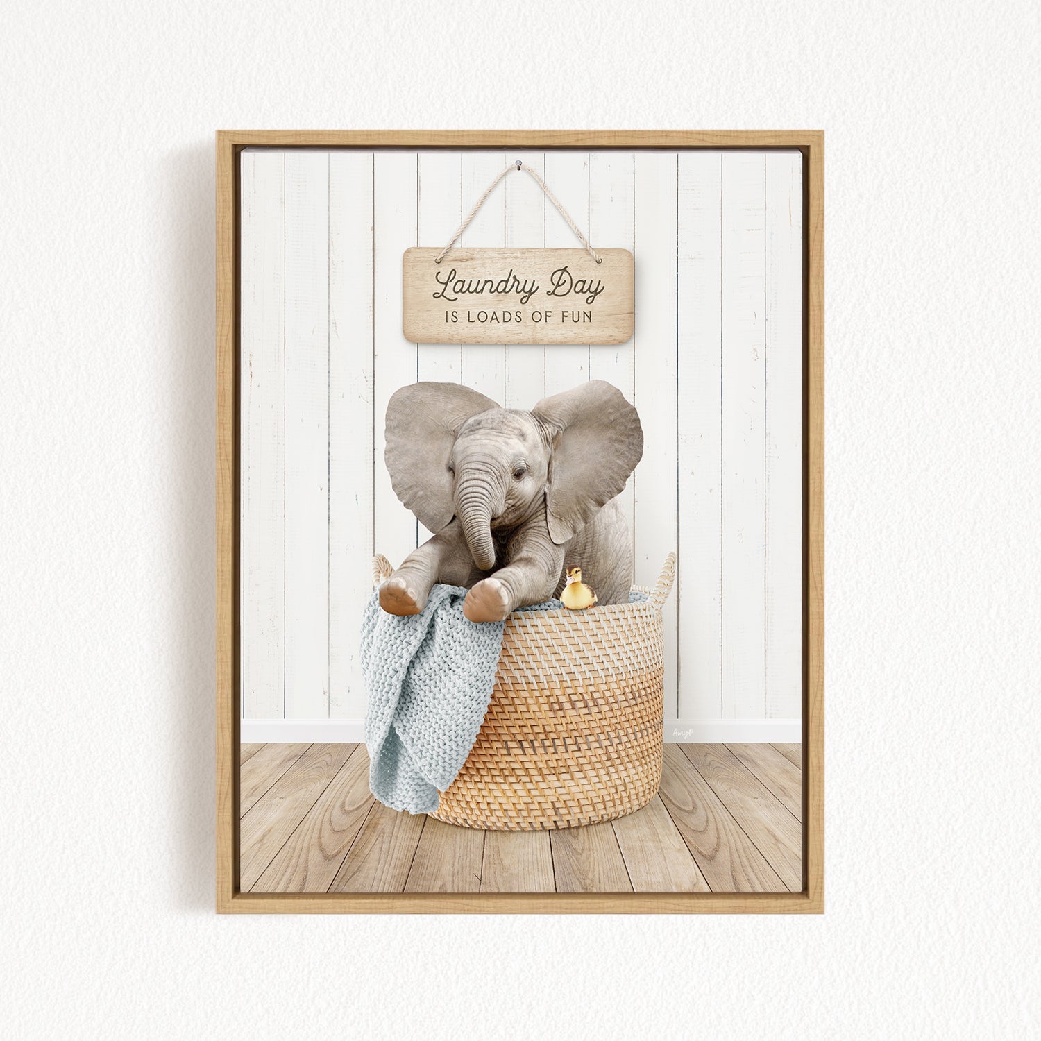 A framed image of a baby elephant sitting in a woven laundry basket, with a sign above that says "Laundry Day is loads of fun".