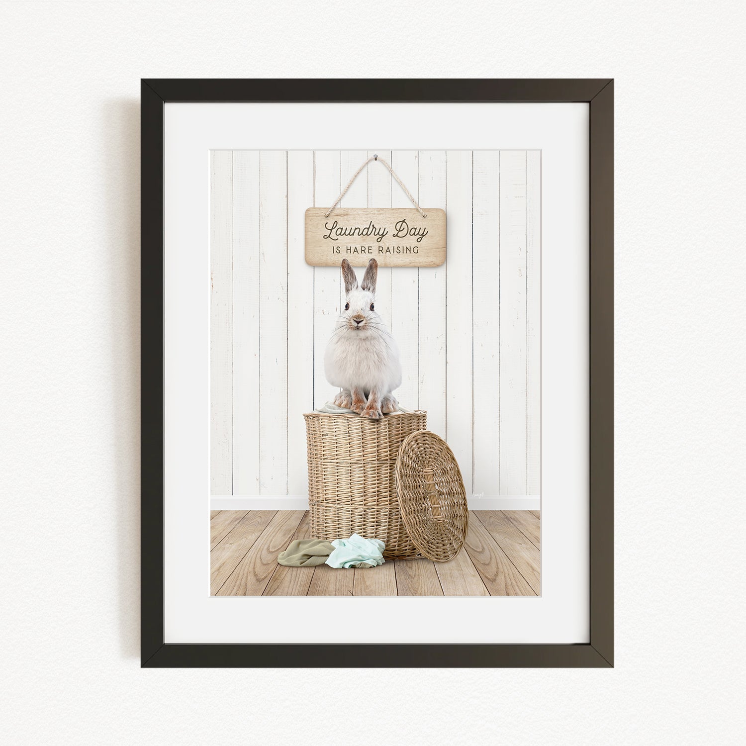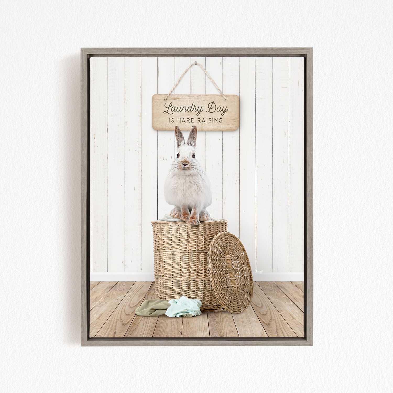 A white rabbit sits atop a wicker basket, with a wooden sign above that reads "Laundry Day is Hard Raising".