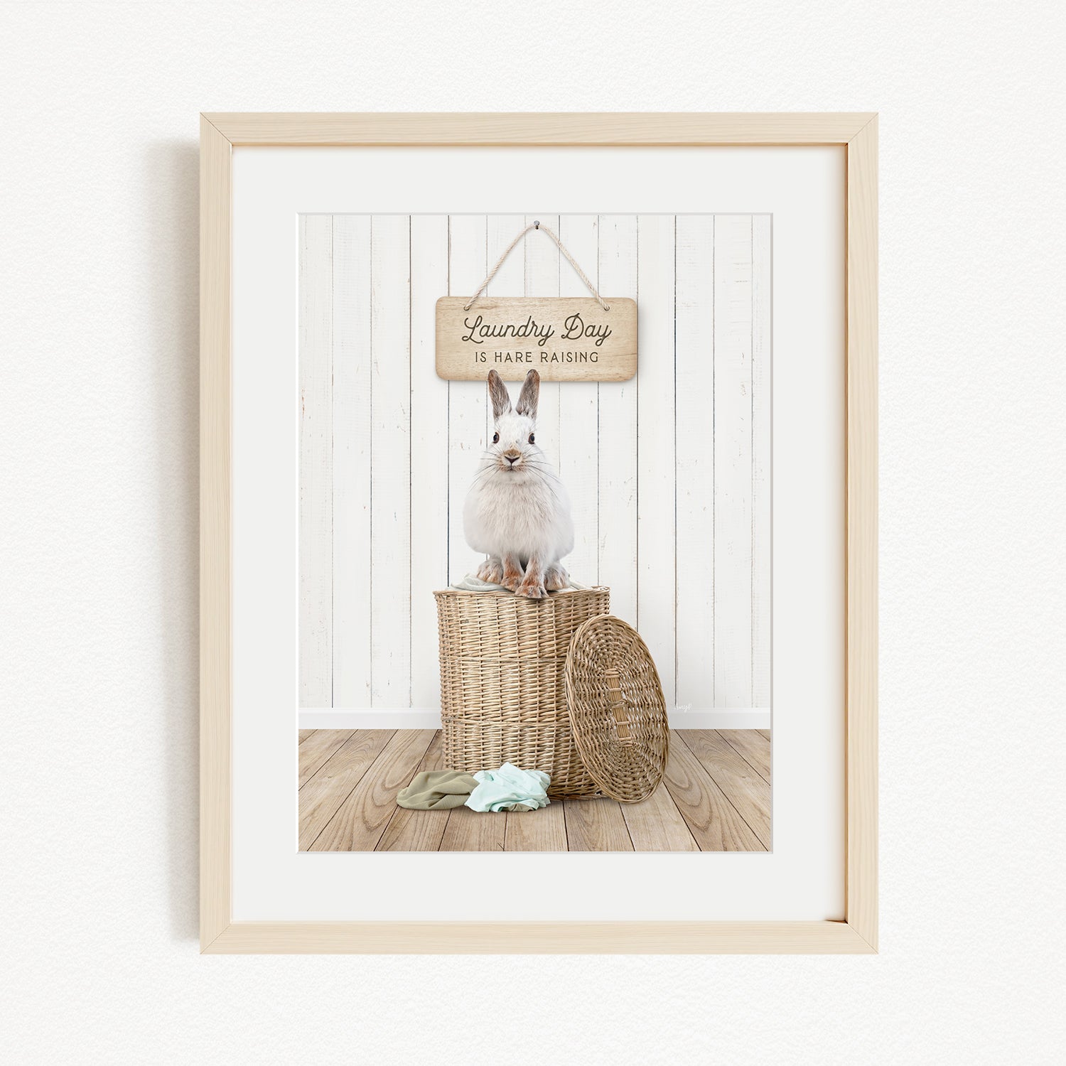A white rabbit sits atop a wicker basket, with a wooden sign above that reads "Laundry Day is harder raising".