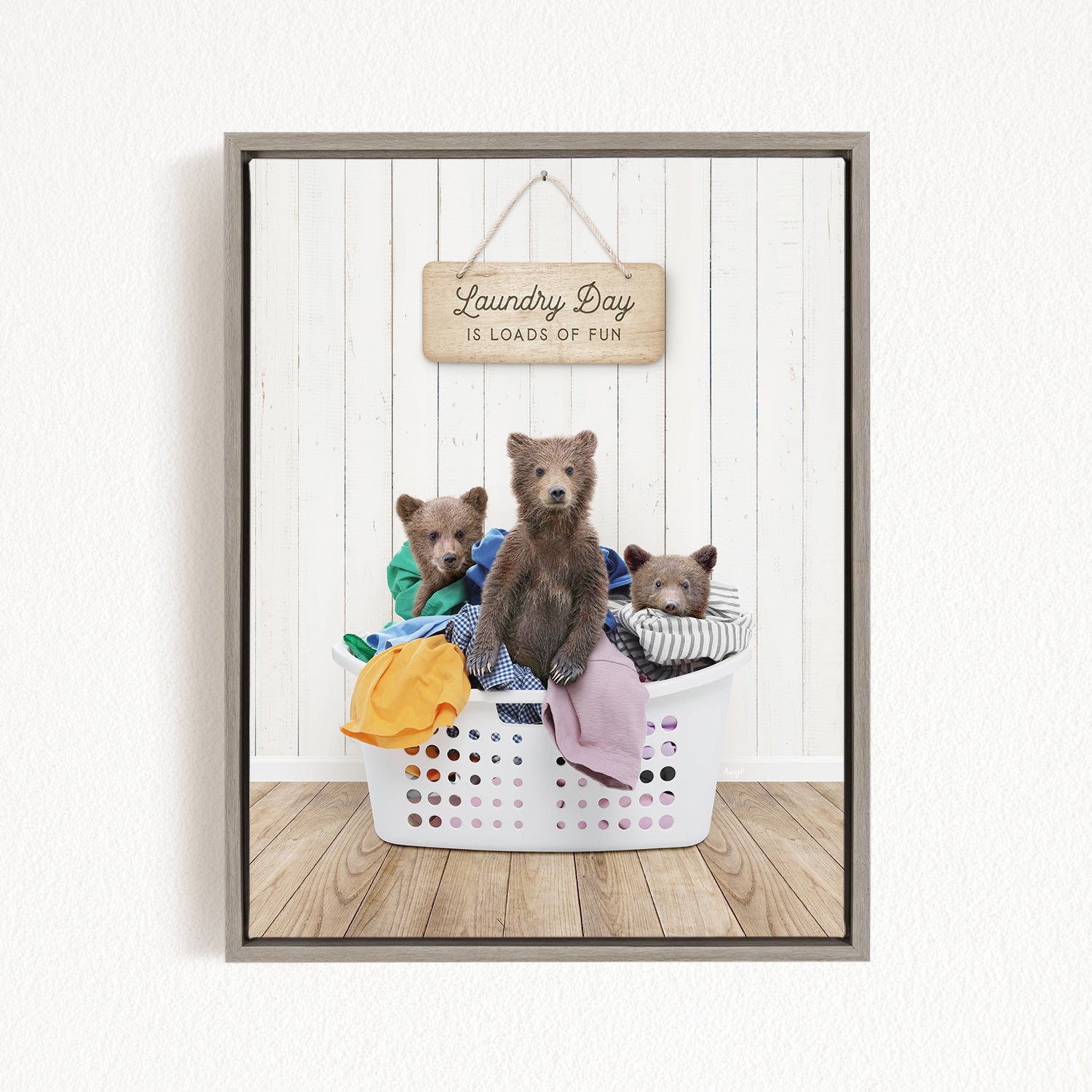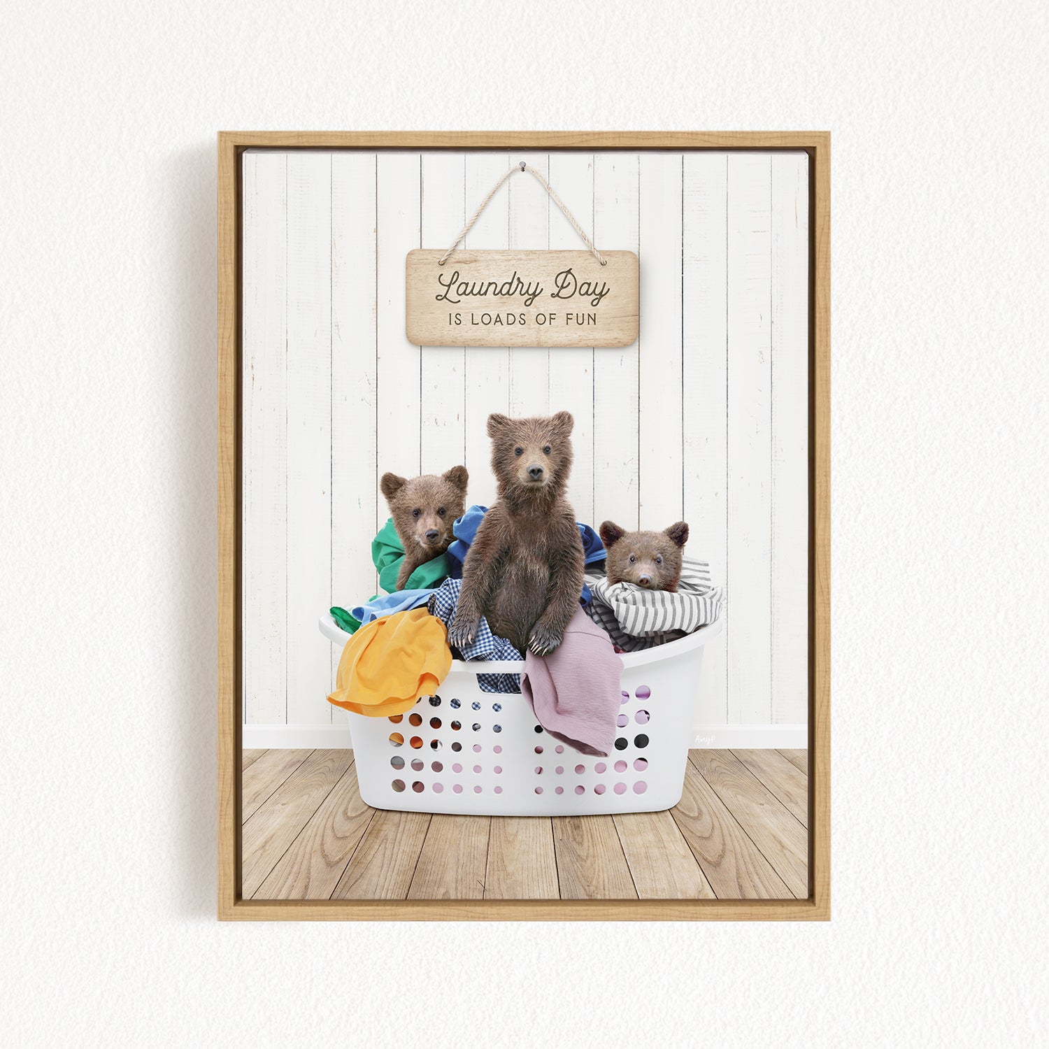 A framed image depicting three bears sitting in a laundry basket, with a sign above them that reads "Laundry Day is loads of fun".