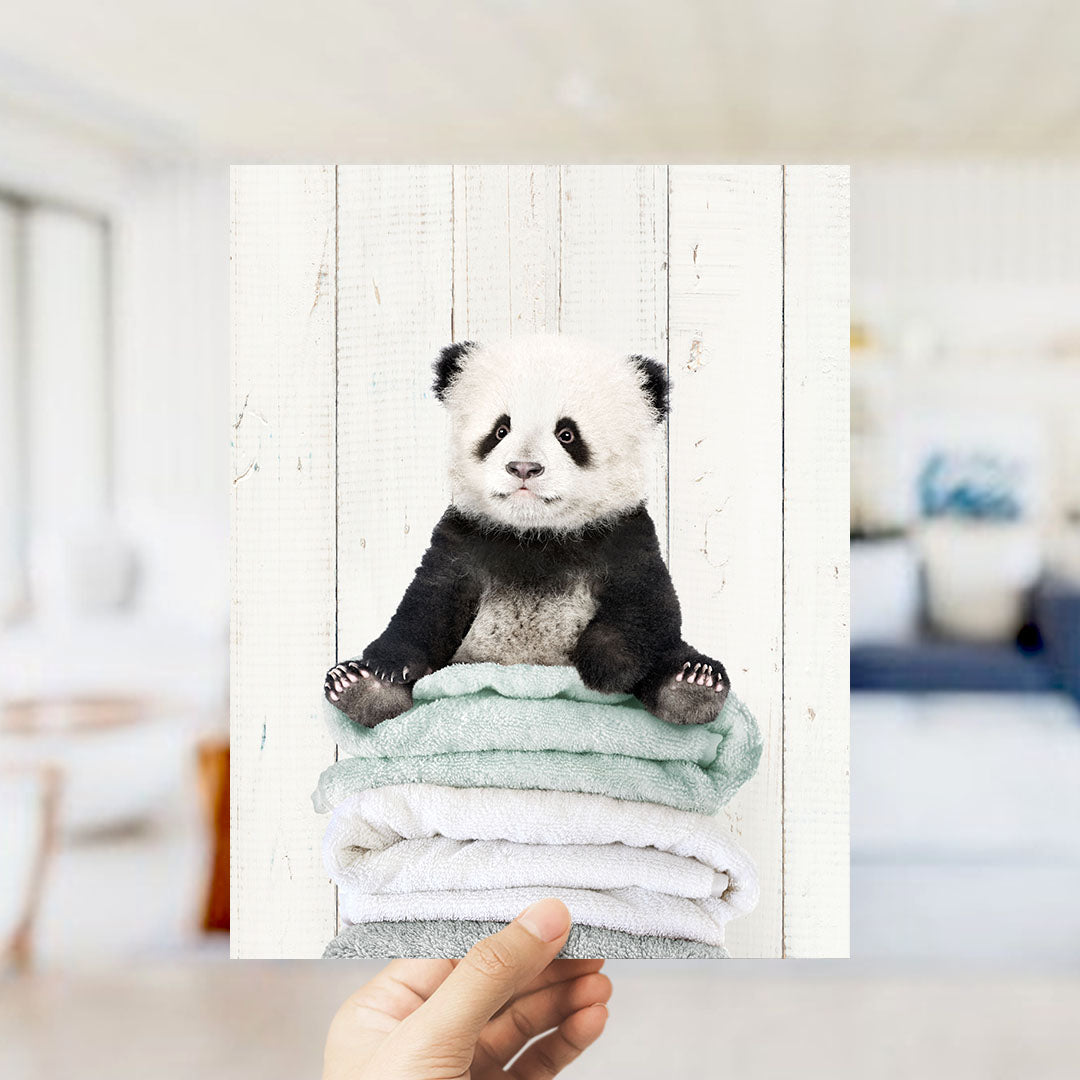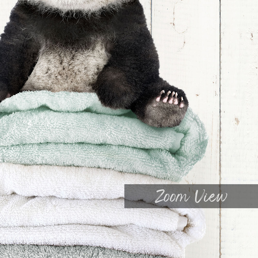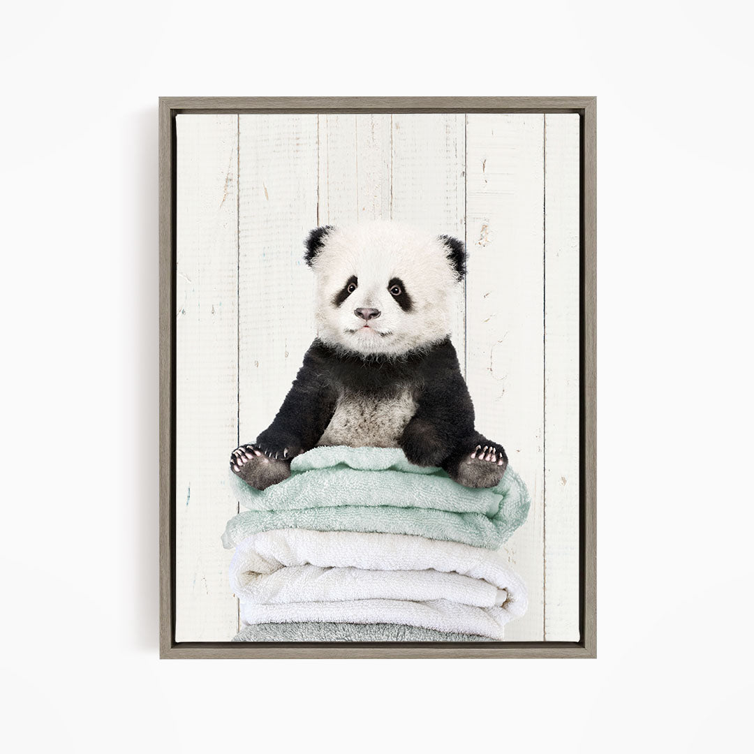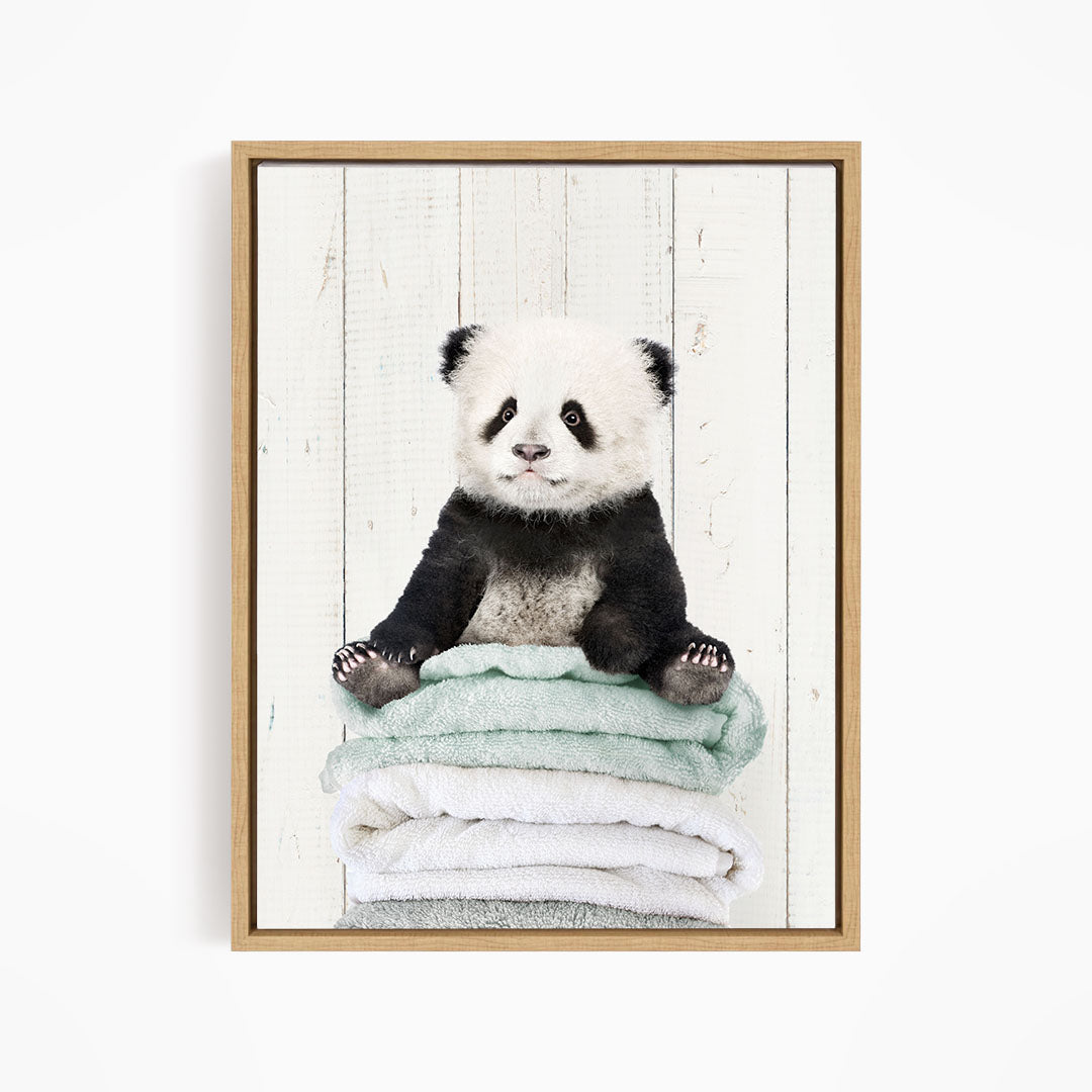 A panda bear sitting on a stack of towels, with a white background and a wooden frame.