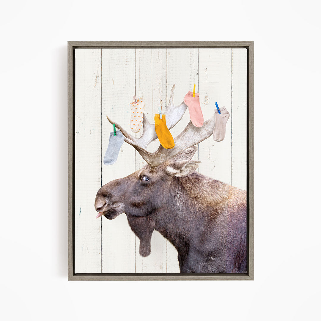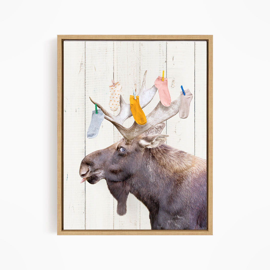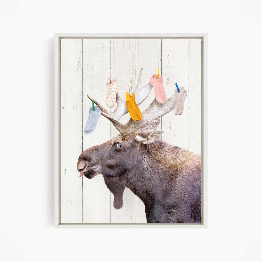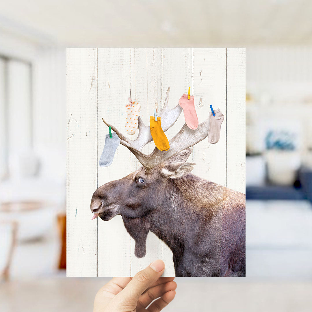A hand is holding up a framed image of a moose with colorful socks hanging from its antlers.