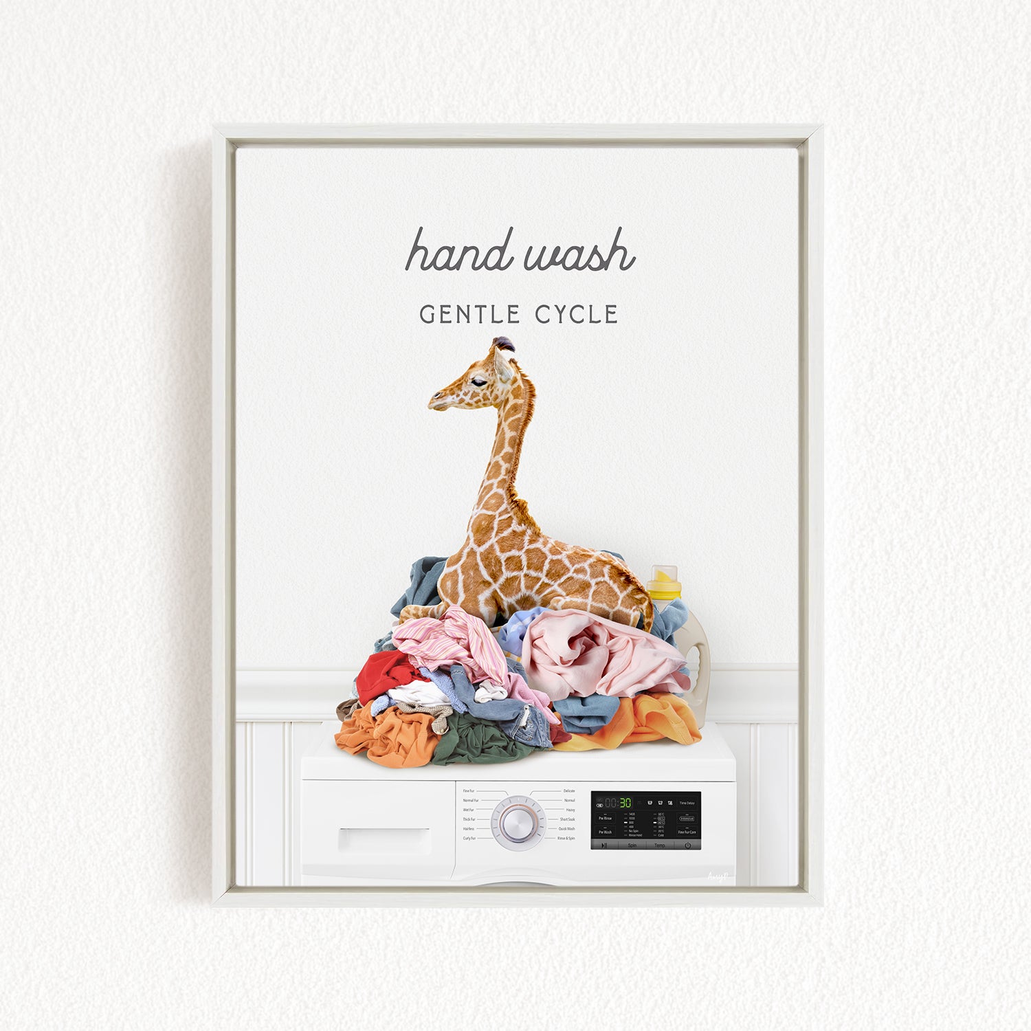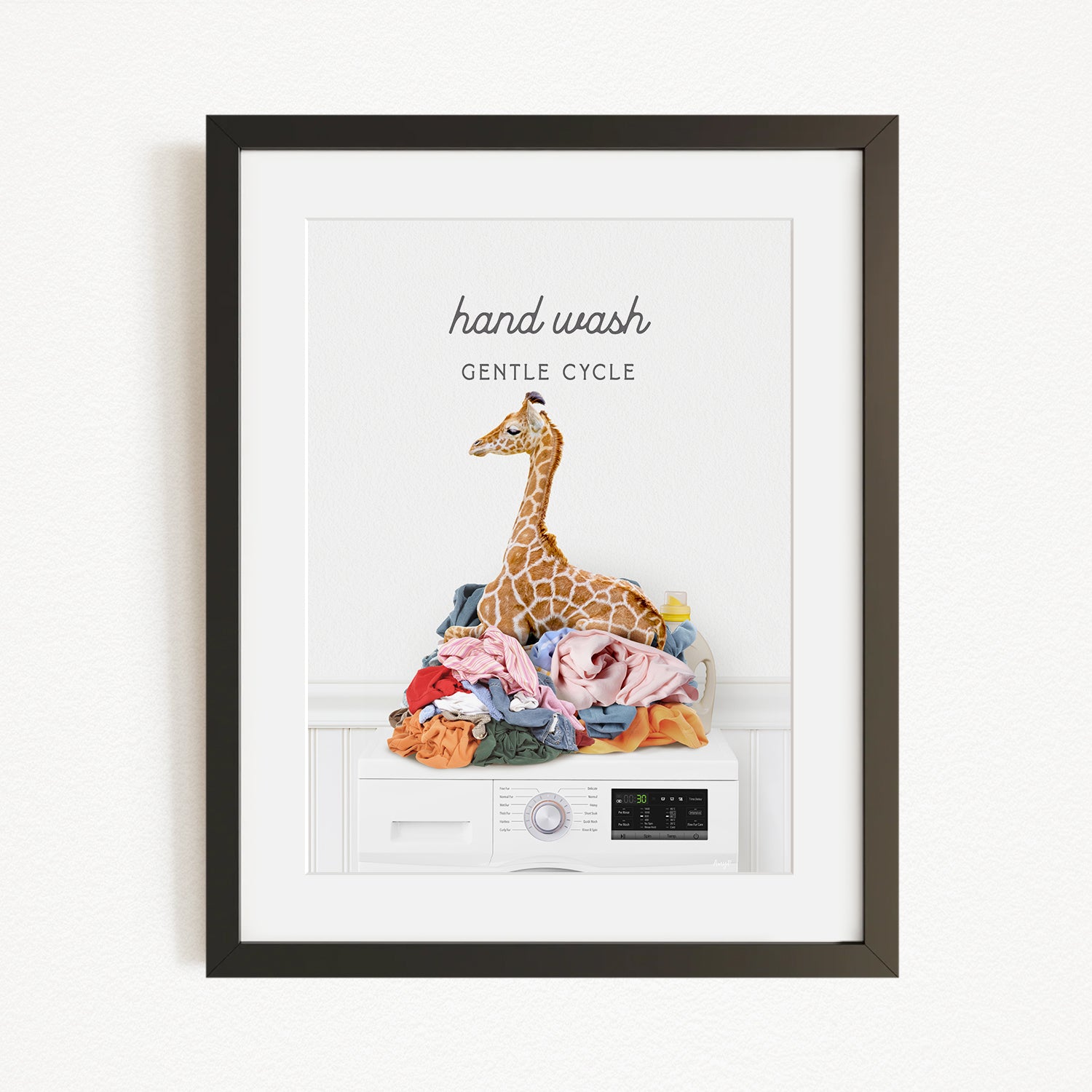 A framed image depicting a giraffe sitting on a pile of laundry, with the text "hand wash gentle cycle" above it.