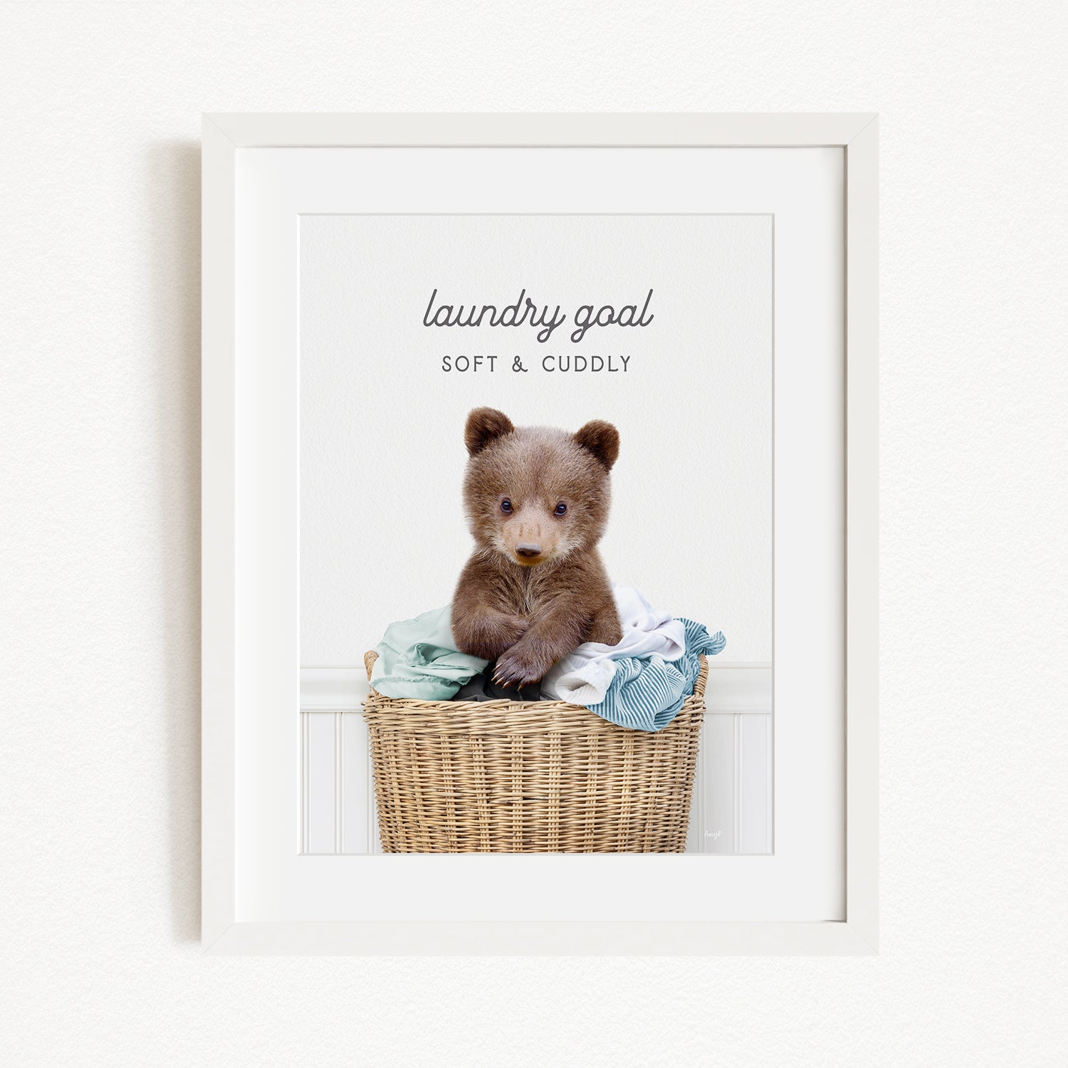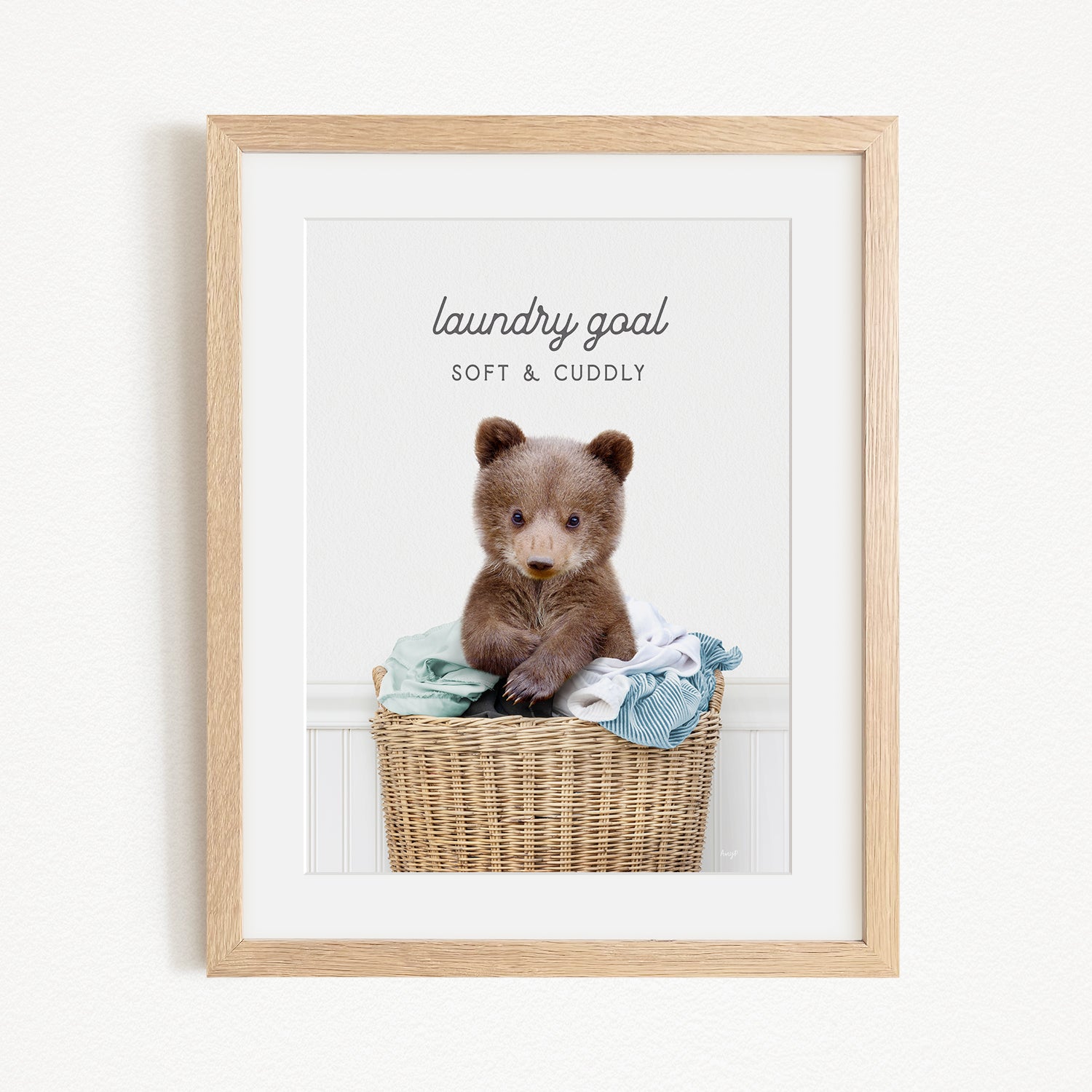 A cute brown bear sitting in a wicker laundry basket filled with clothes, with the text "laundry goal" and "soft & cuddly" written above it.