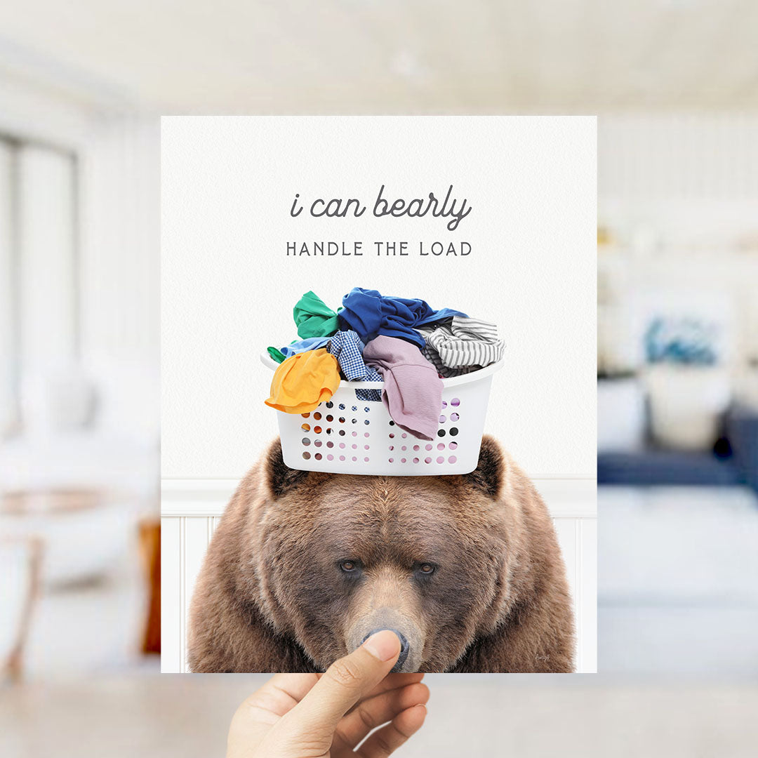 A brown bear sits in front of a laundry basket filled with clothes, with the text "I can bearly handle the load" written above the basket.