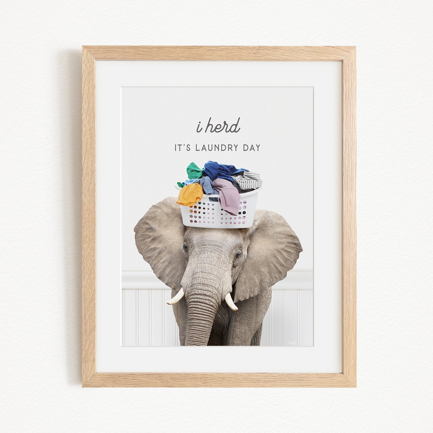 A framed image of an elephant carrying a laundry basket on its head, with the text "It's laundry day" written above it.
