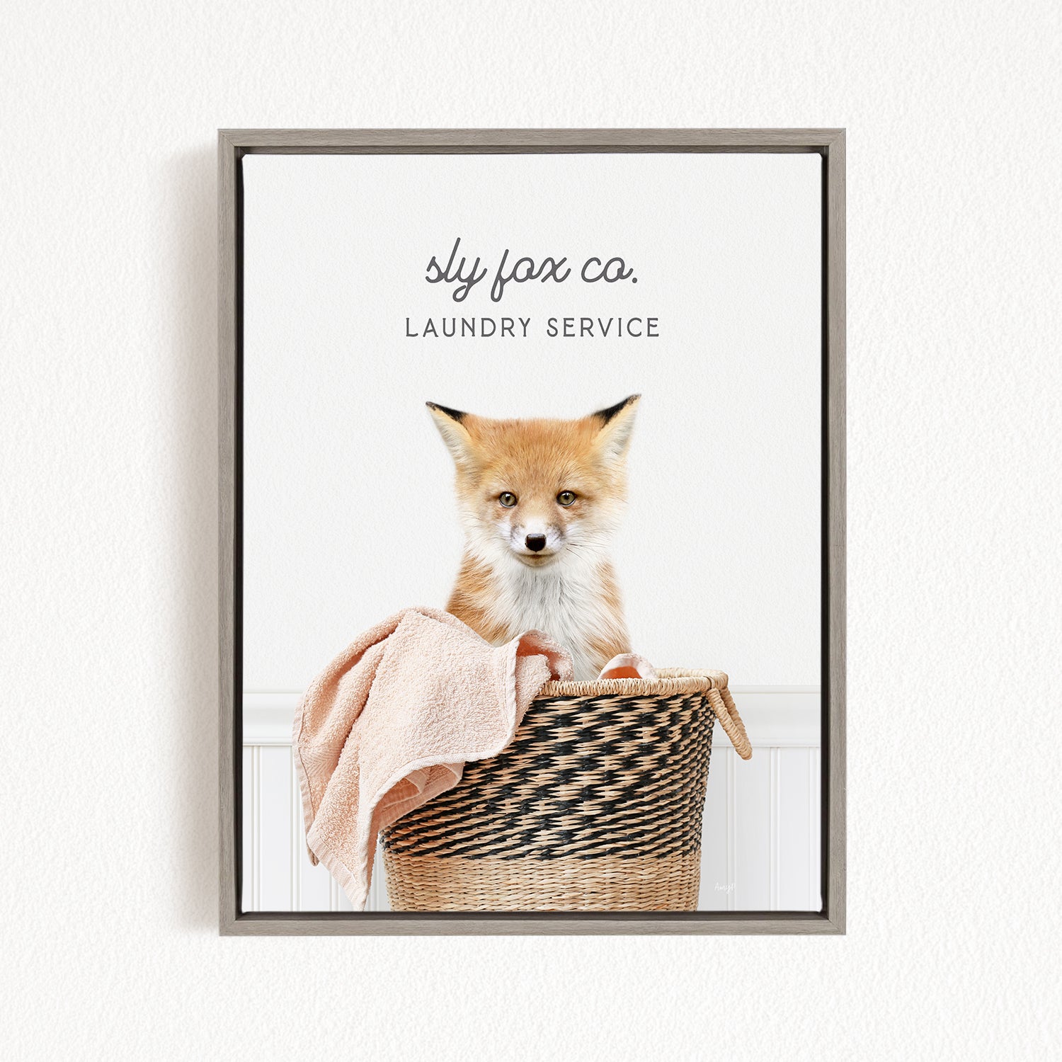 A framed image of a young fox sitting in a woven laundry basket, with the text "sky fox co. Laundry service" displayed above the fox.