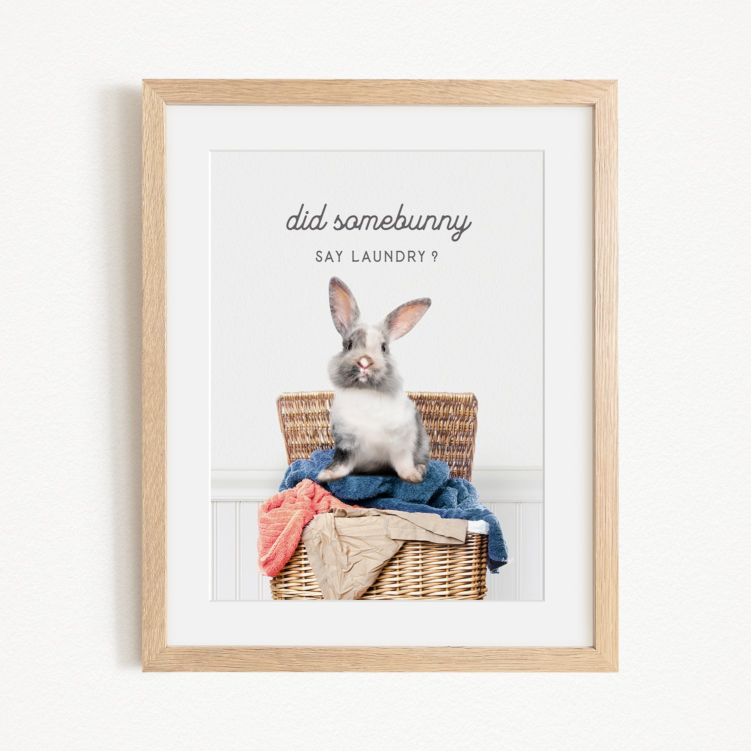 A framed image of a rabbit sitting in a wicker basket filled with laundry, with the text "did some bunny" and "Say laundry?" displayed above the rabbit.