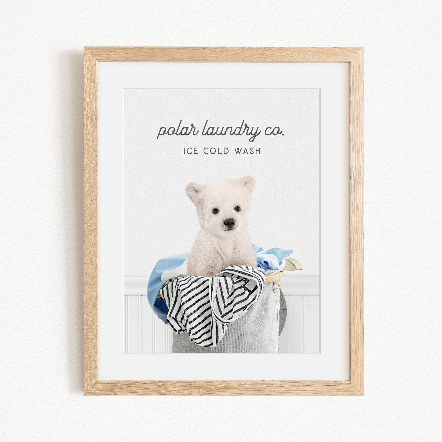 A framed image of a white dog sitting in a laundry basket filled with clothes, with the text "polar laundry co. ICE COLD WASH" displayed above the dog.