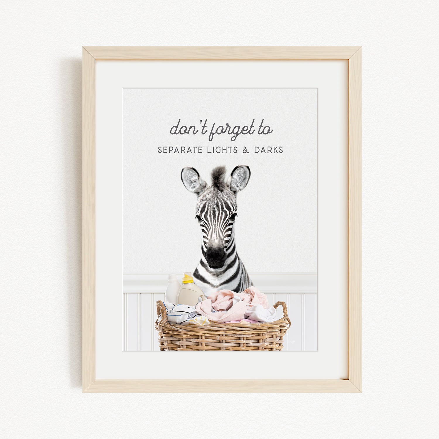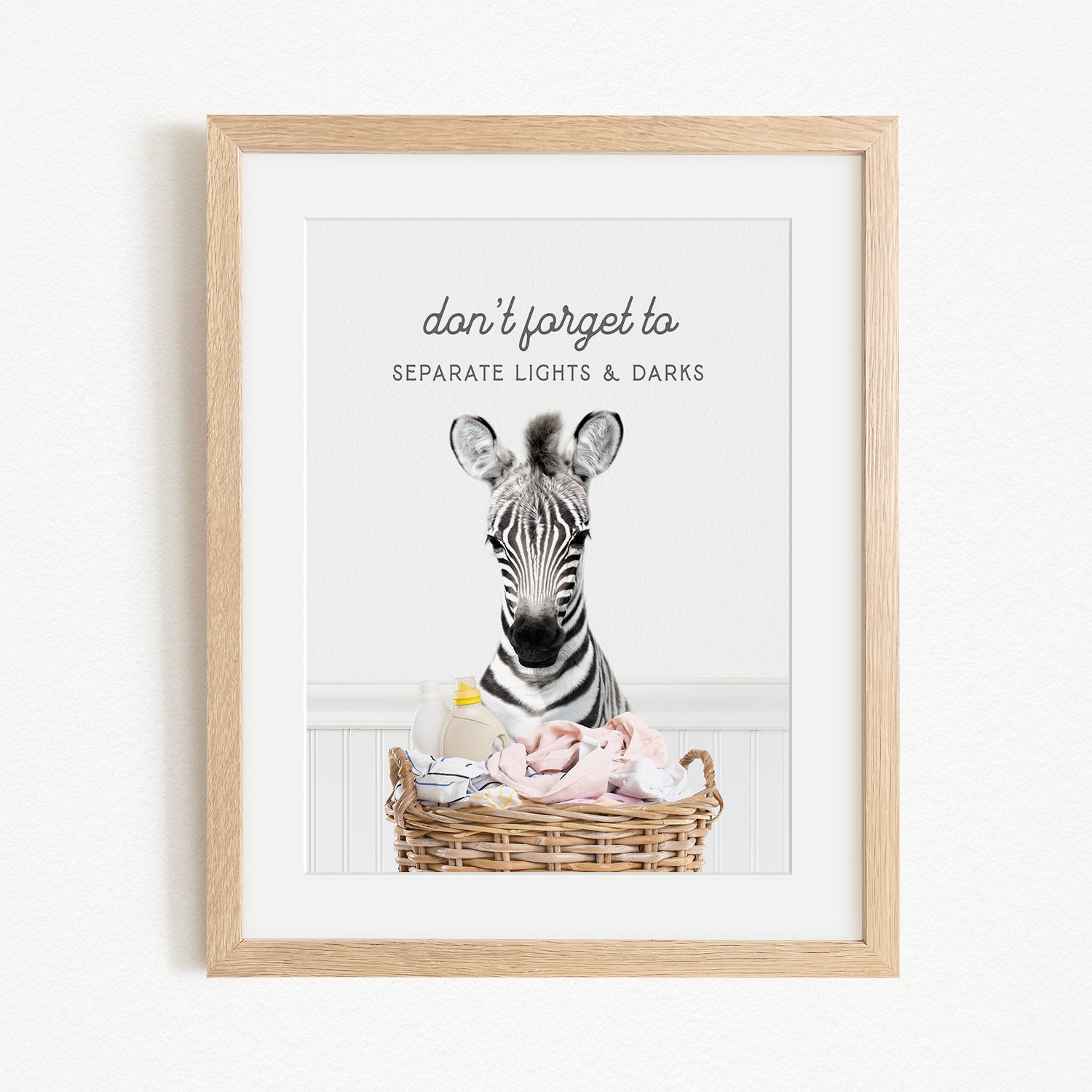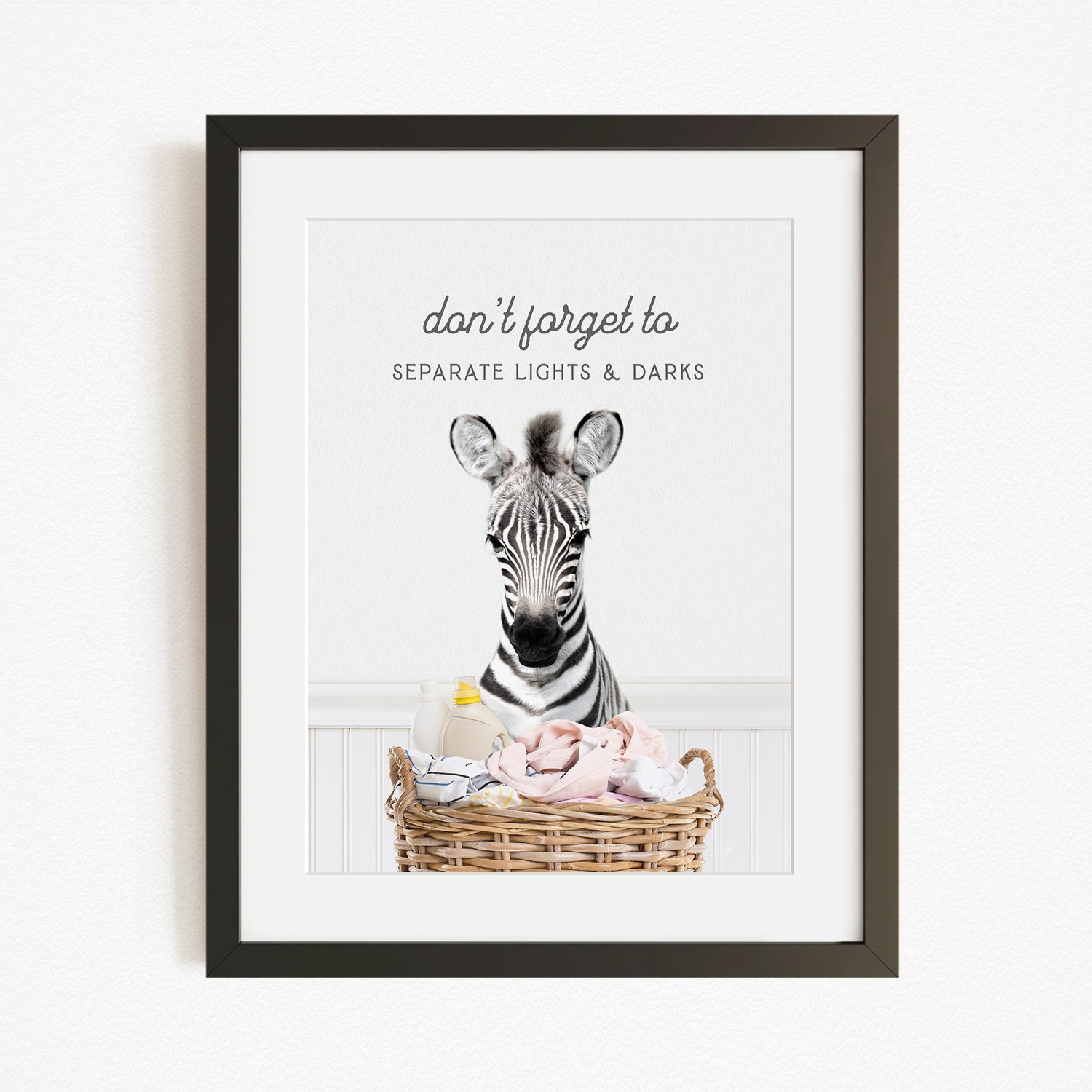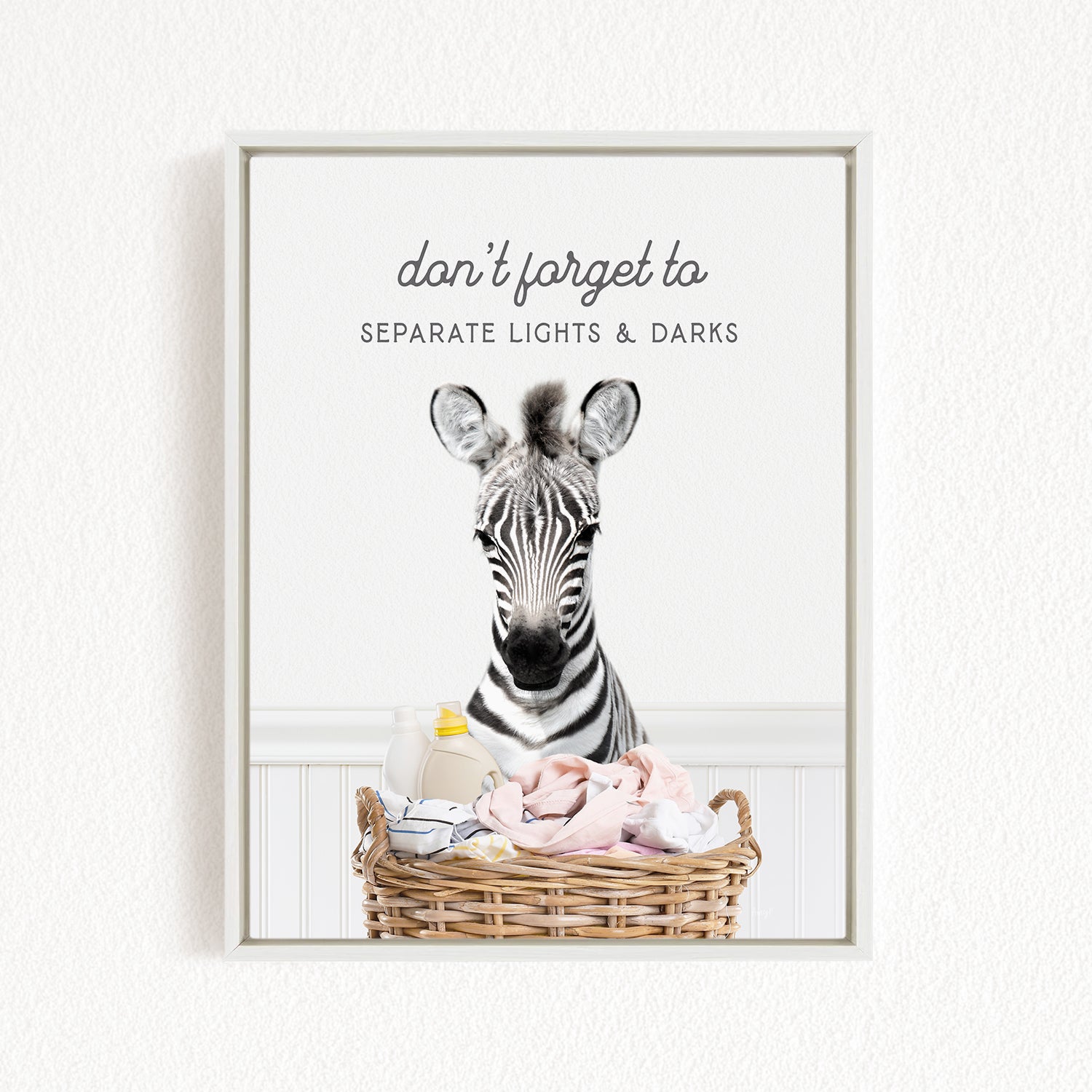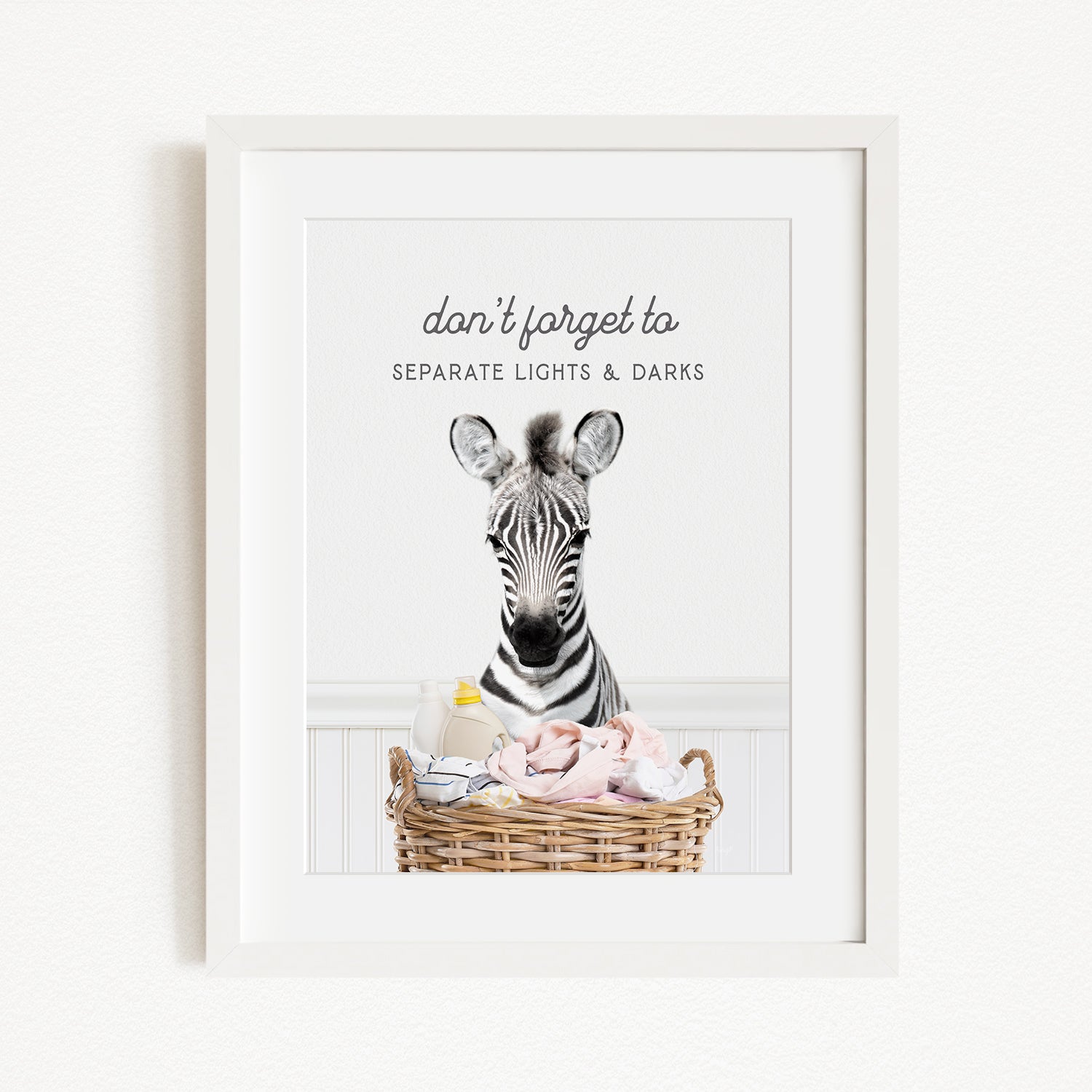 A framed image of a zebra standing in a basket filled with baby items, with the text "don't forget to separate lights & darks" written above the zebra.