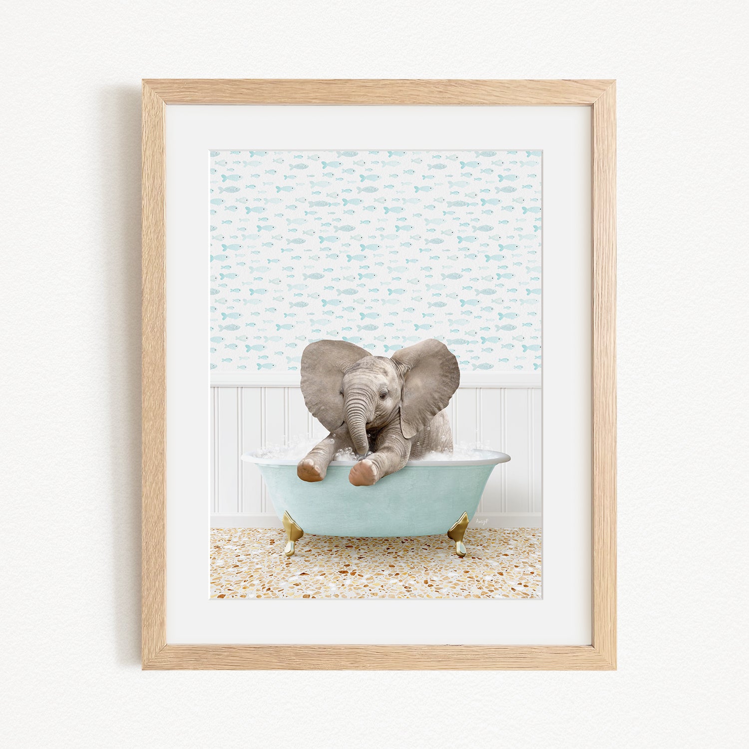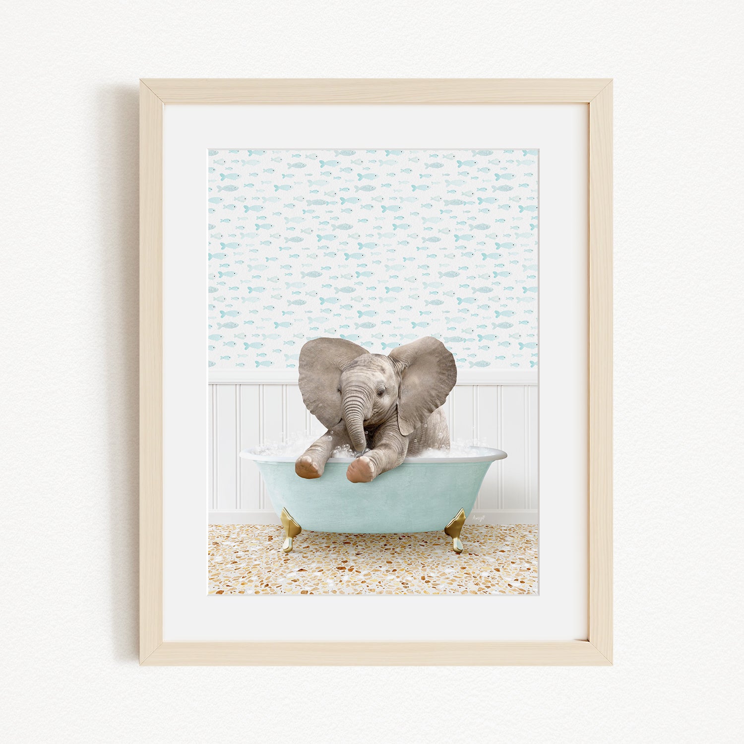 A baby elephant sitting in a light blue bathtub, surrounded by a patterned wall and a wooden frame.