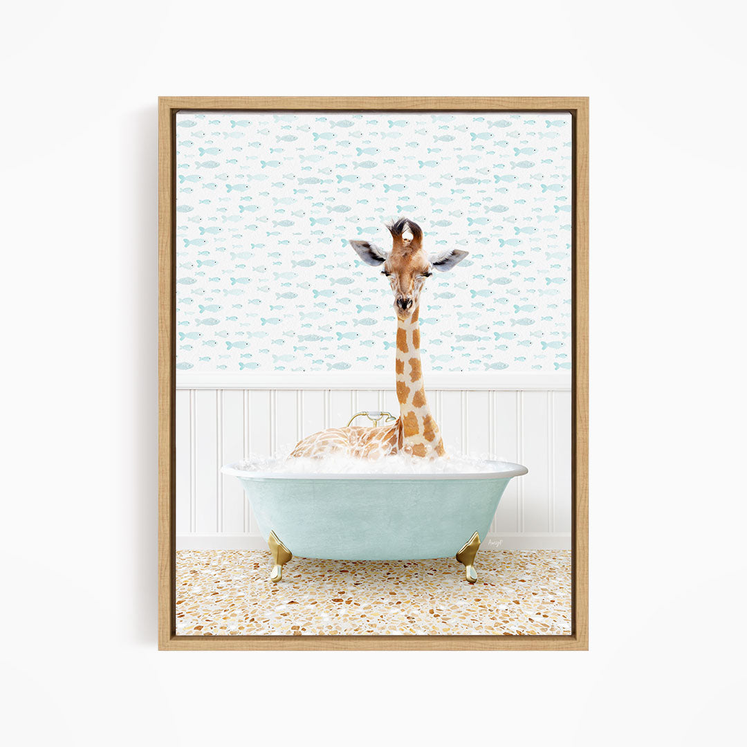 A giraffe sitting in a bathtub filled with bubbles, surrounded by a pattern of fish.