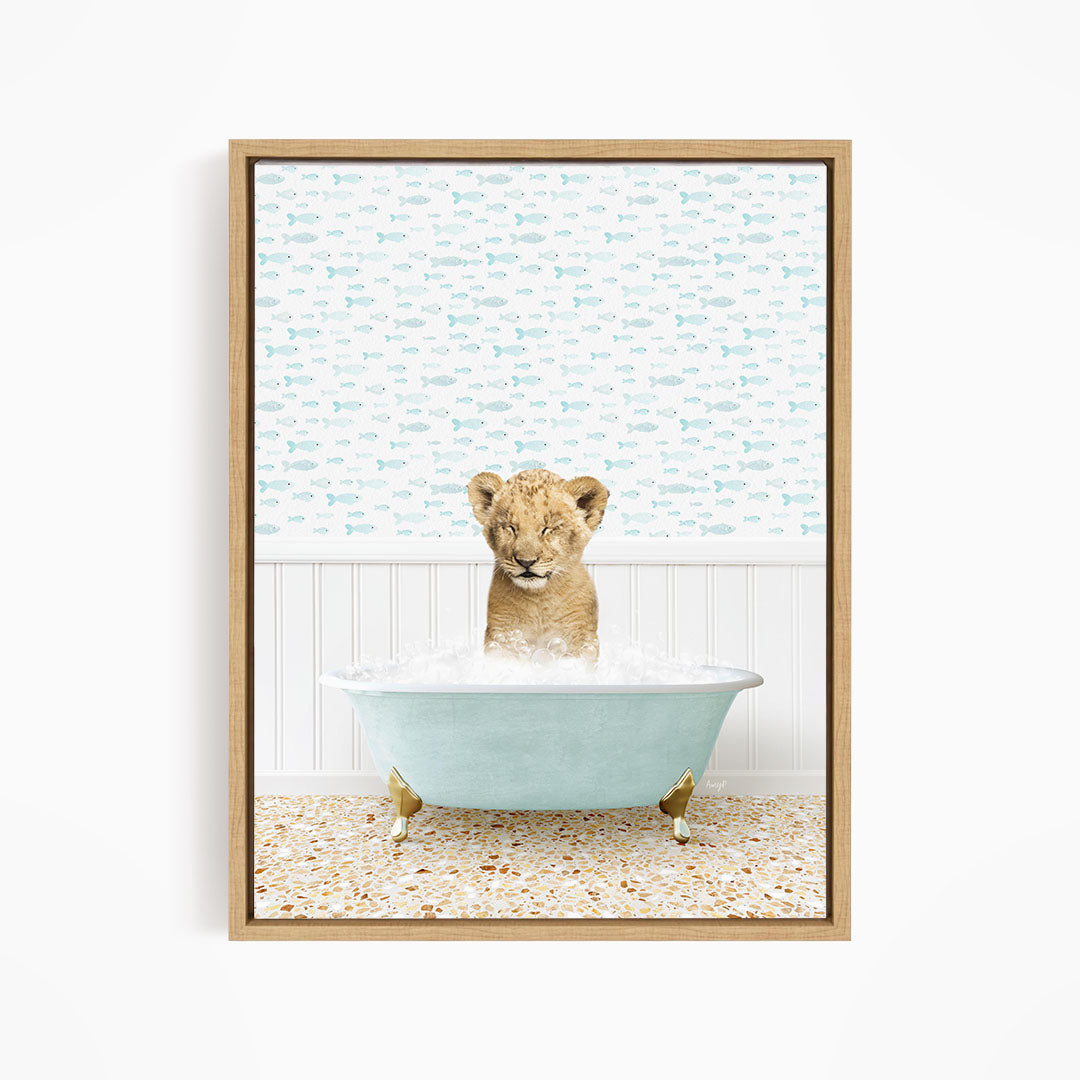 A young lion cub sitting in a blue bathtub filled with water, surrounded by a pattern of fish.