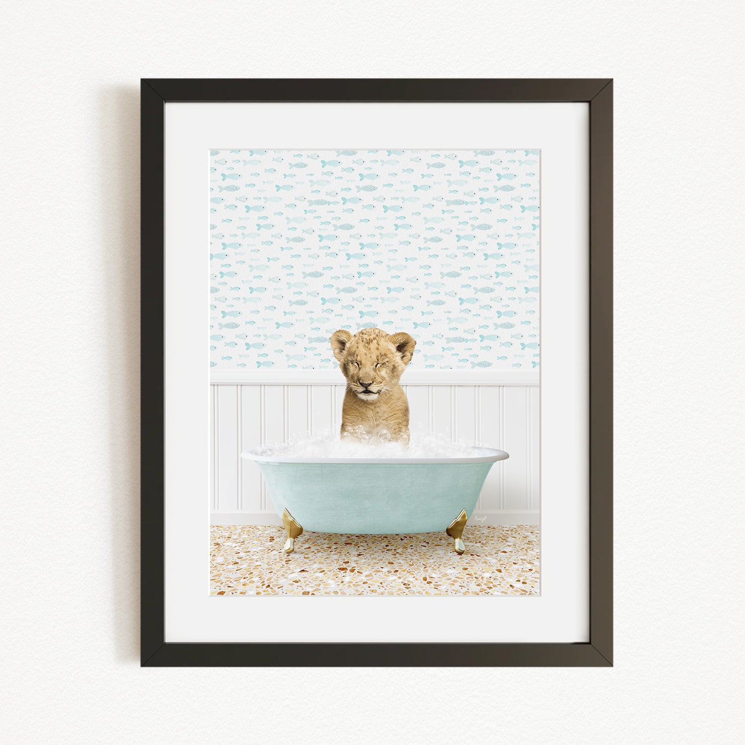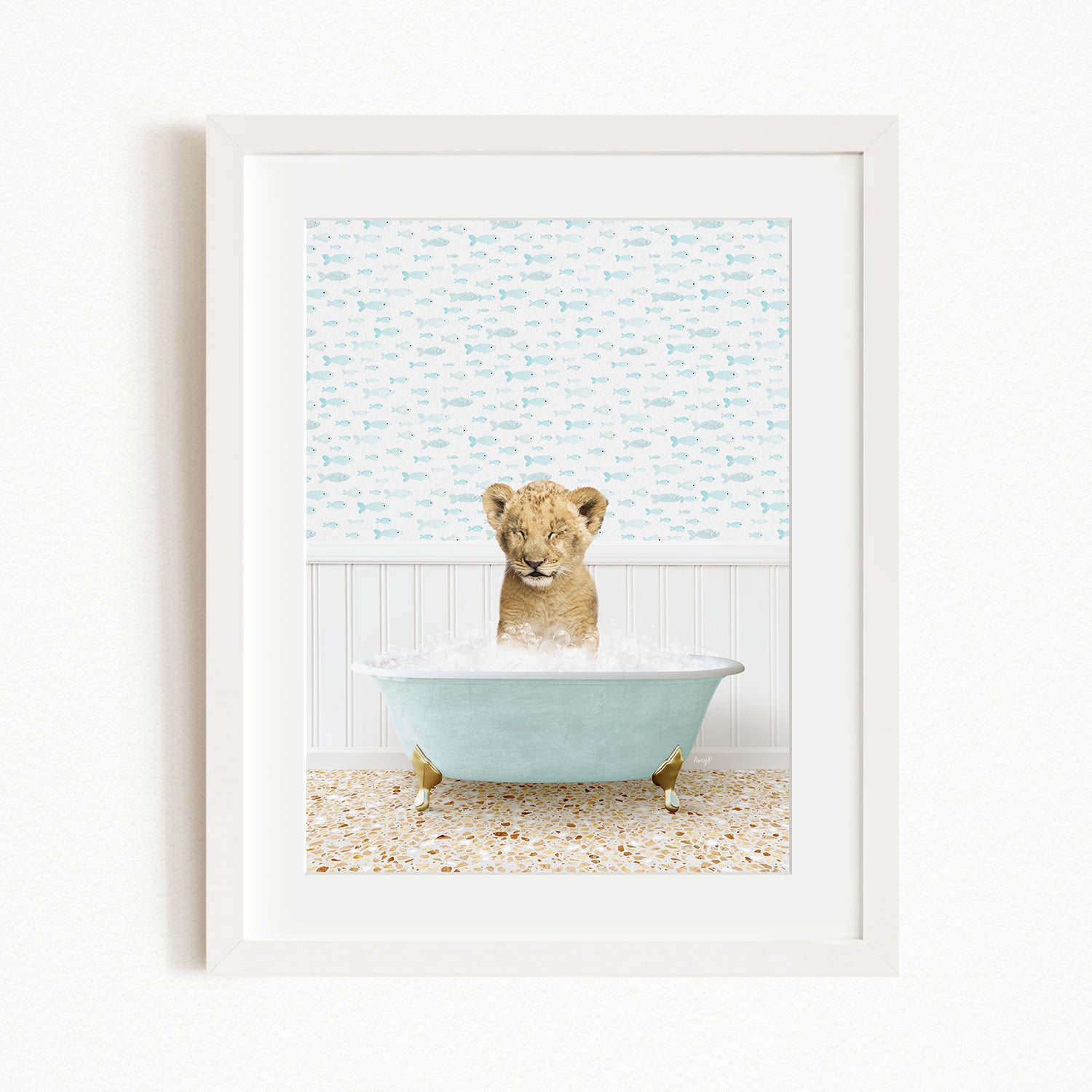 A young lion cub sitting in a bathtub filled with water, surrounded by a pattern of fish.
