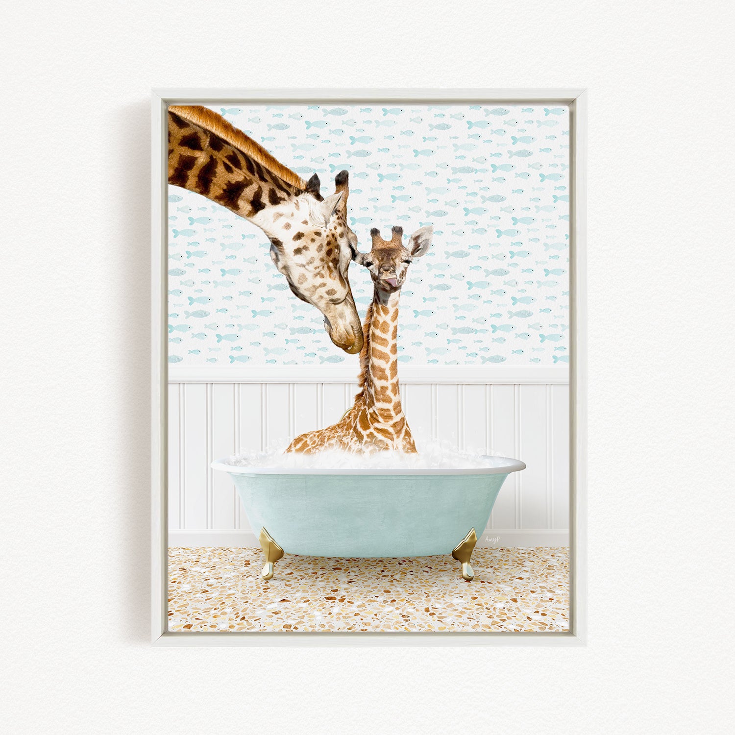 A mother giraffe and her baby giraffe are enjoying a relaxing bath together in a light blue bathtub, surrounded by a patterned tile floor.