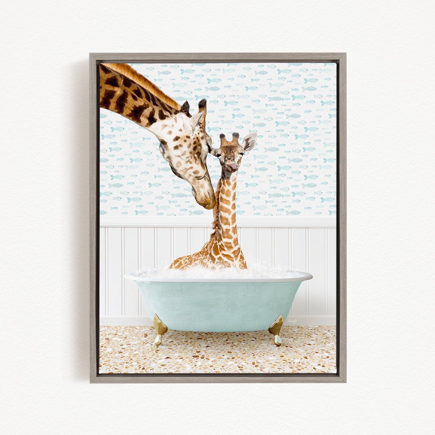 A mother giraffe and her baby giraffe are enjoying a relaxing bath in a light blue bathtub, surrounded by a patterned wall and floor.