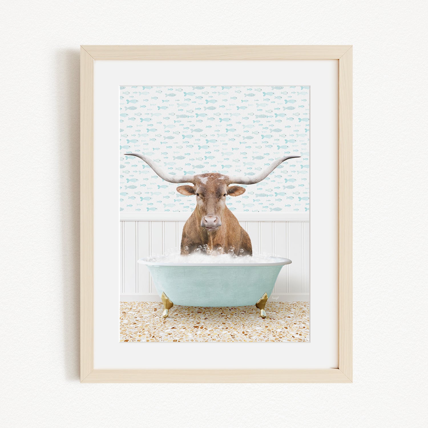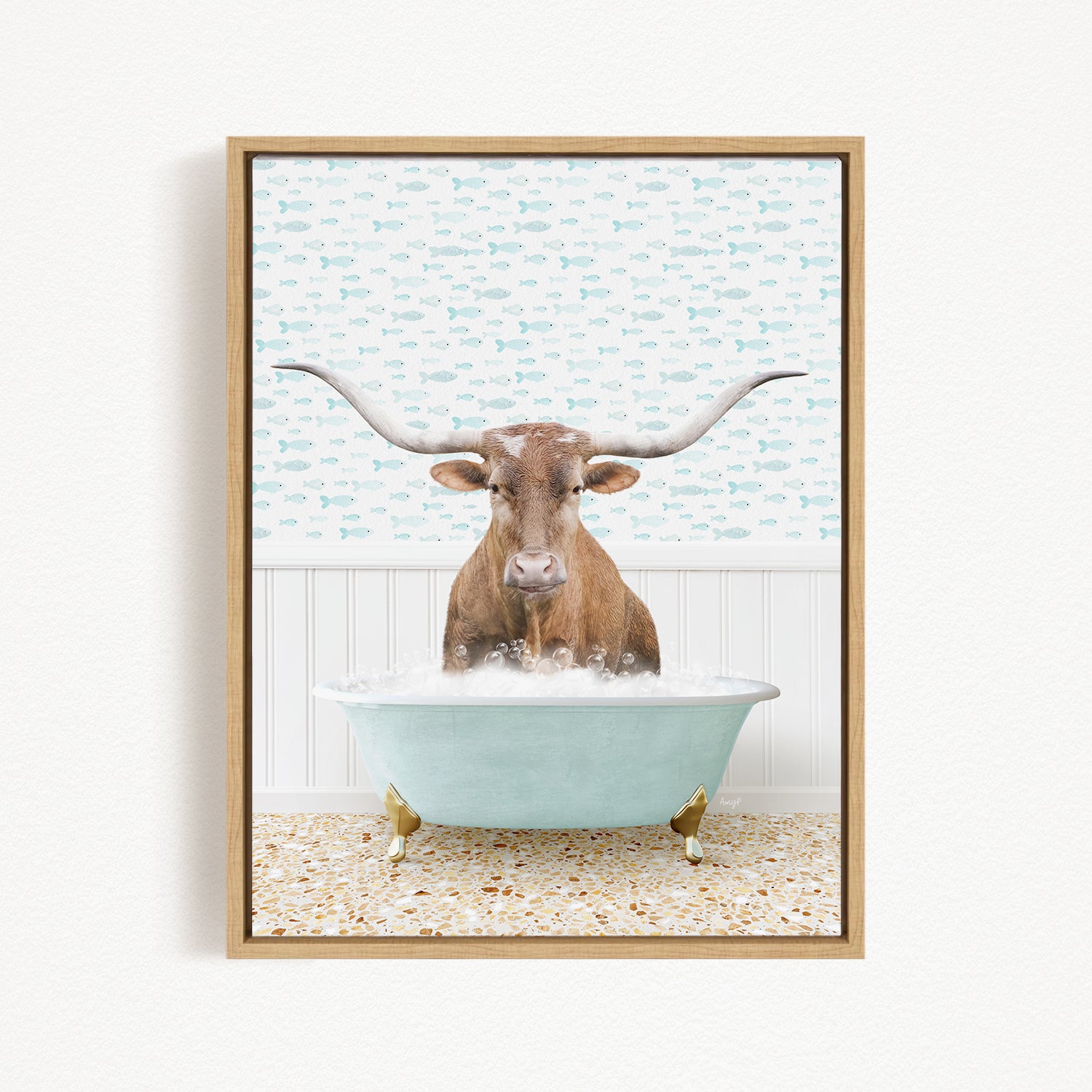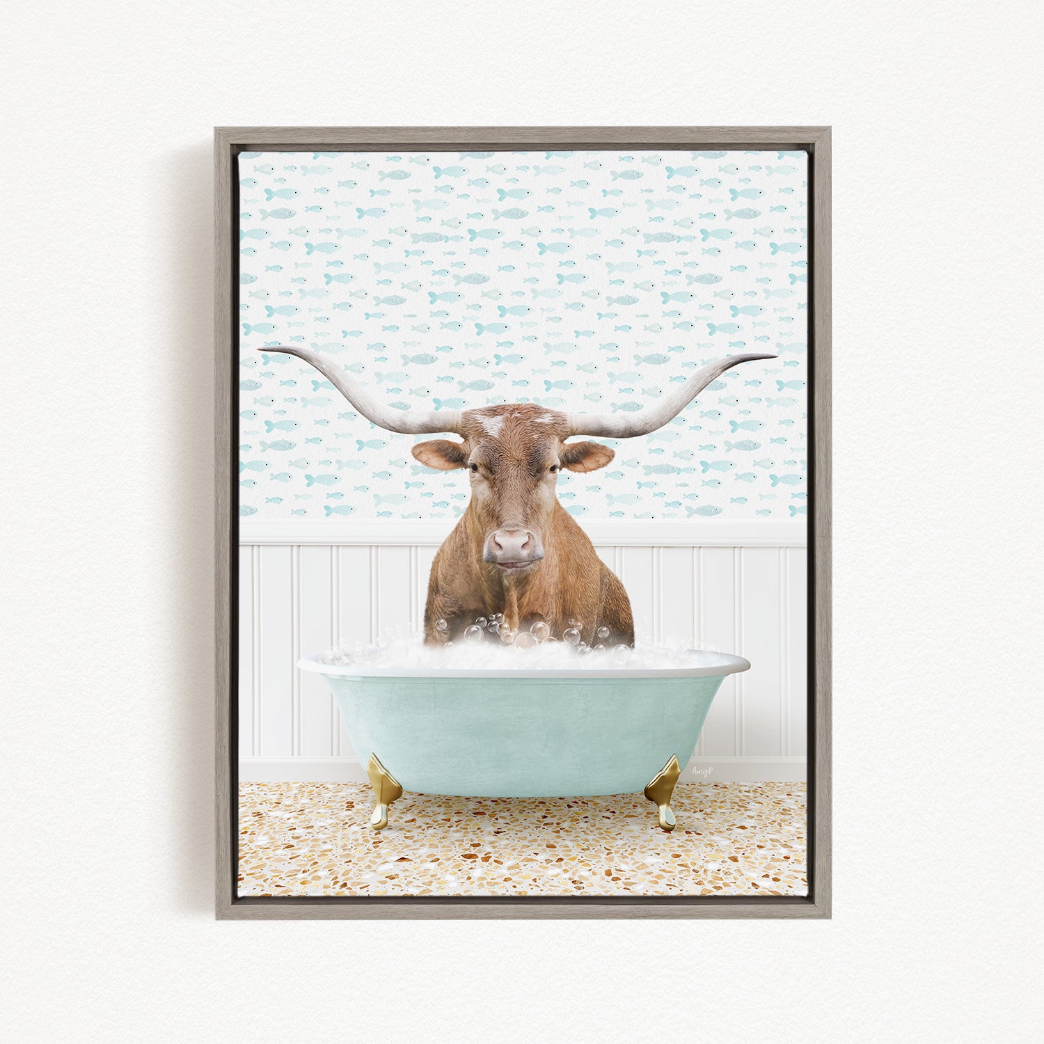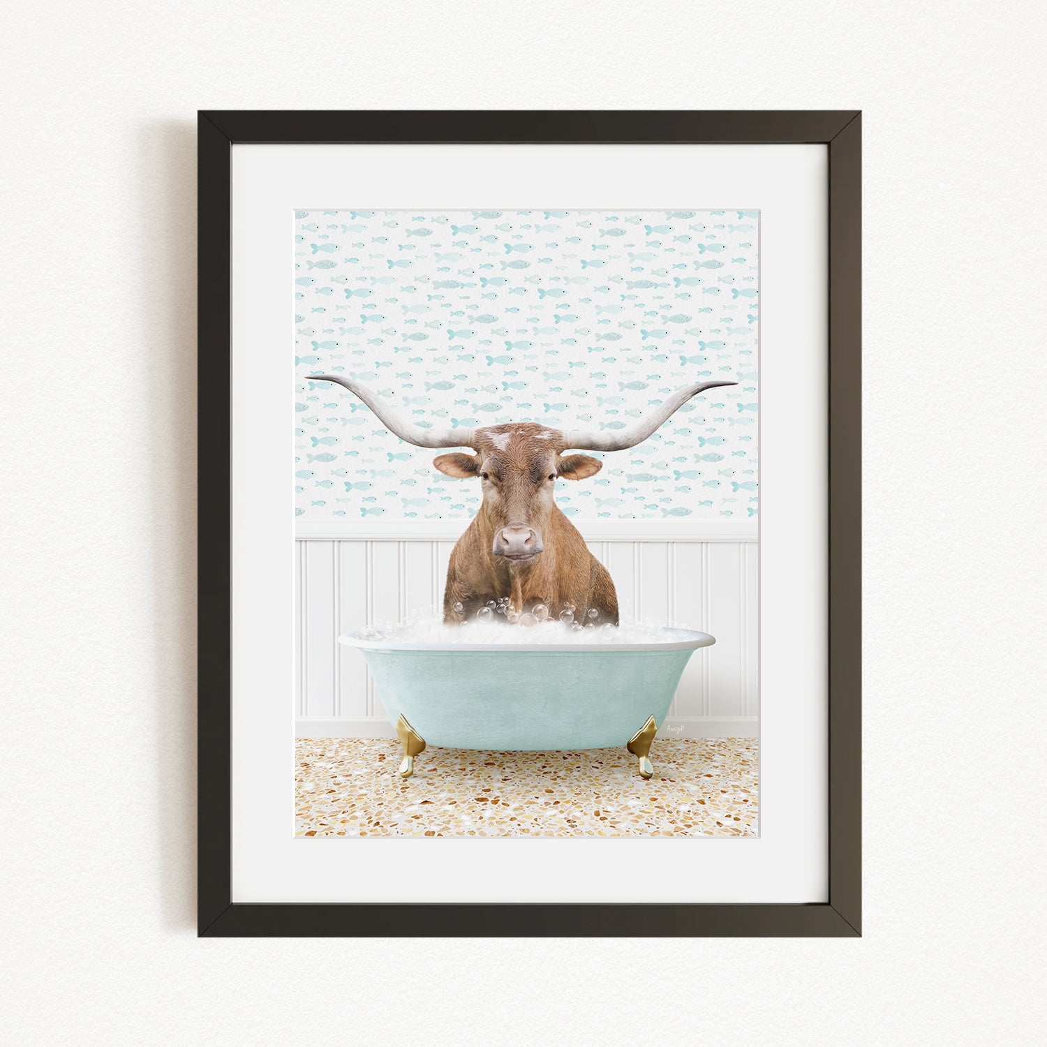 A framed image depicting a brown cow with large horns sitting in a light blue bathtub filled with bubbles.