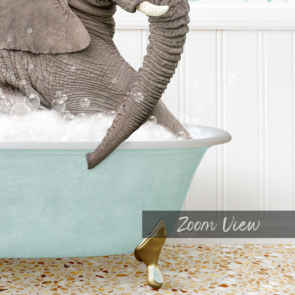 A hand holds up a framed image of a gray elephant sitting in a light blue bathtub filled with bubbles, surrounded by a pattern of small fish.