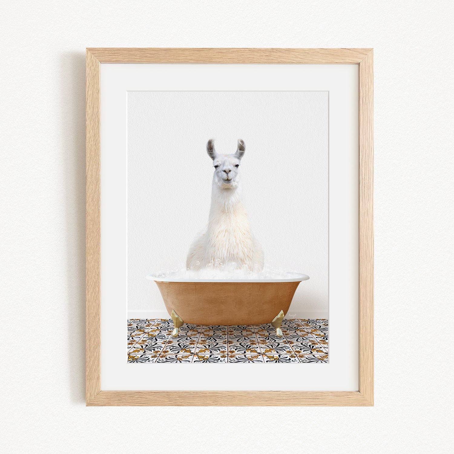 A white llama sitting in a brown bathtub filled with bubbles, with a patterned tile floor in the background.