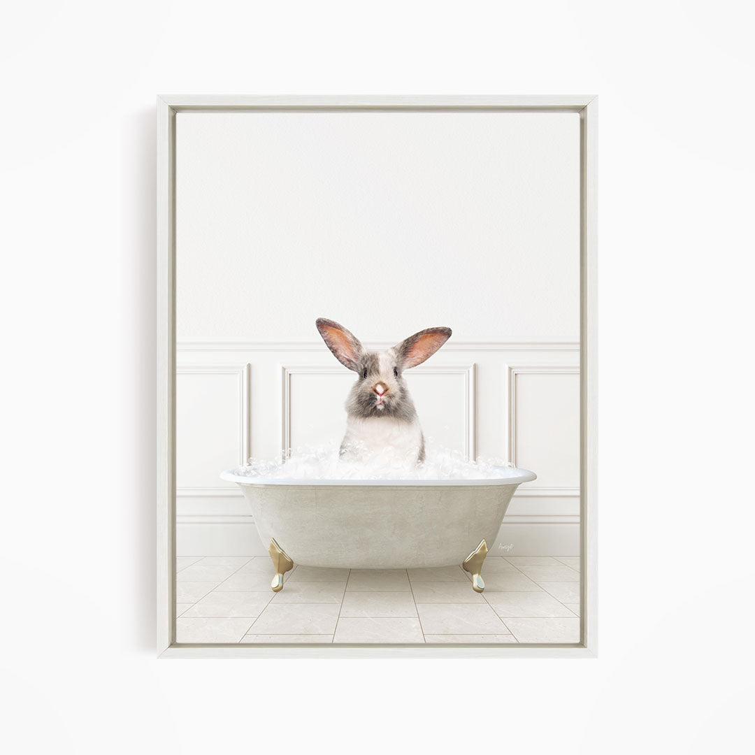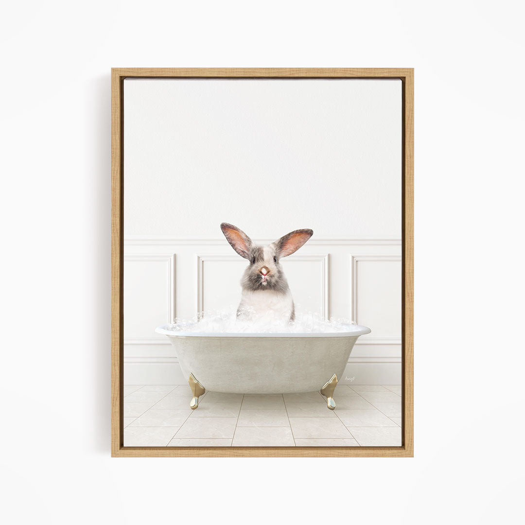 A hand holds up a framed image of a rabbit sitting in a bathtub filled with water, with a blurred background suggesting a bathroom setting.