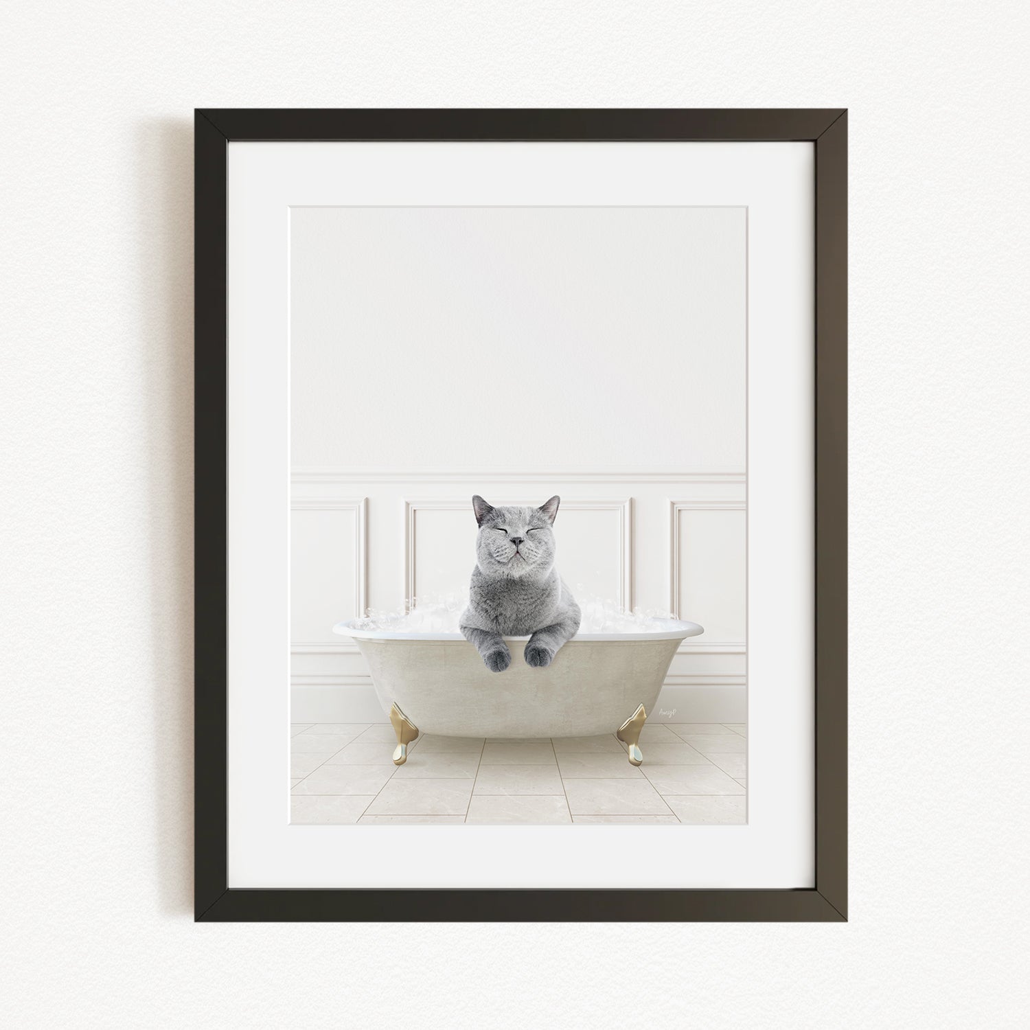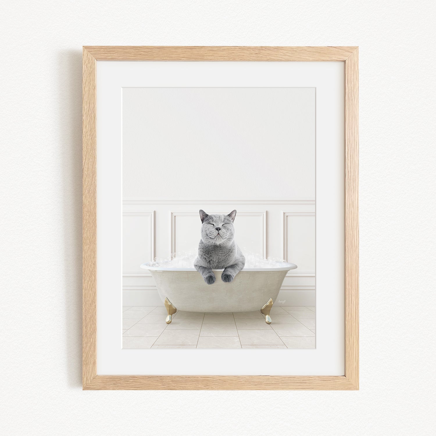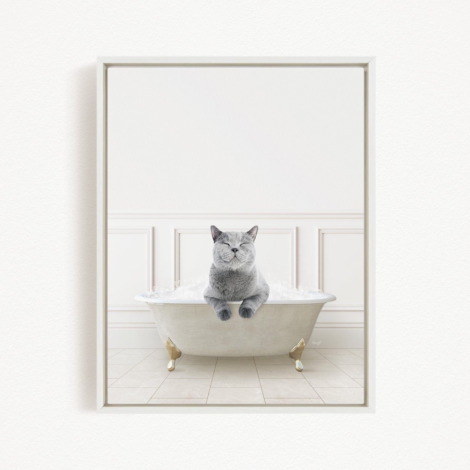 A gray cat sitting in a white bathtub filled with bubbles, with a white wall and a wooden frame as the background.
