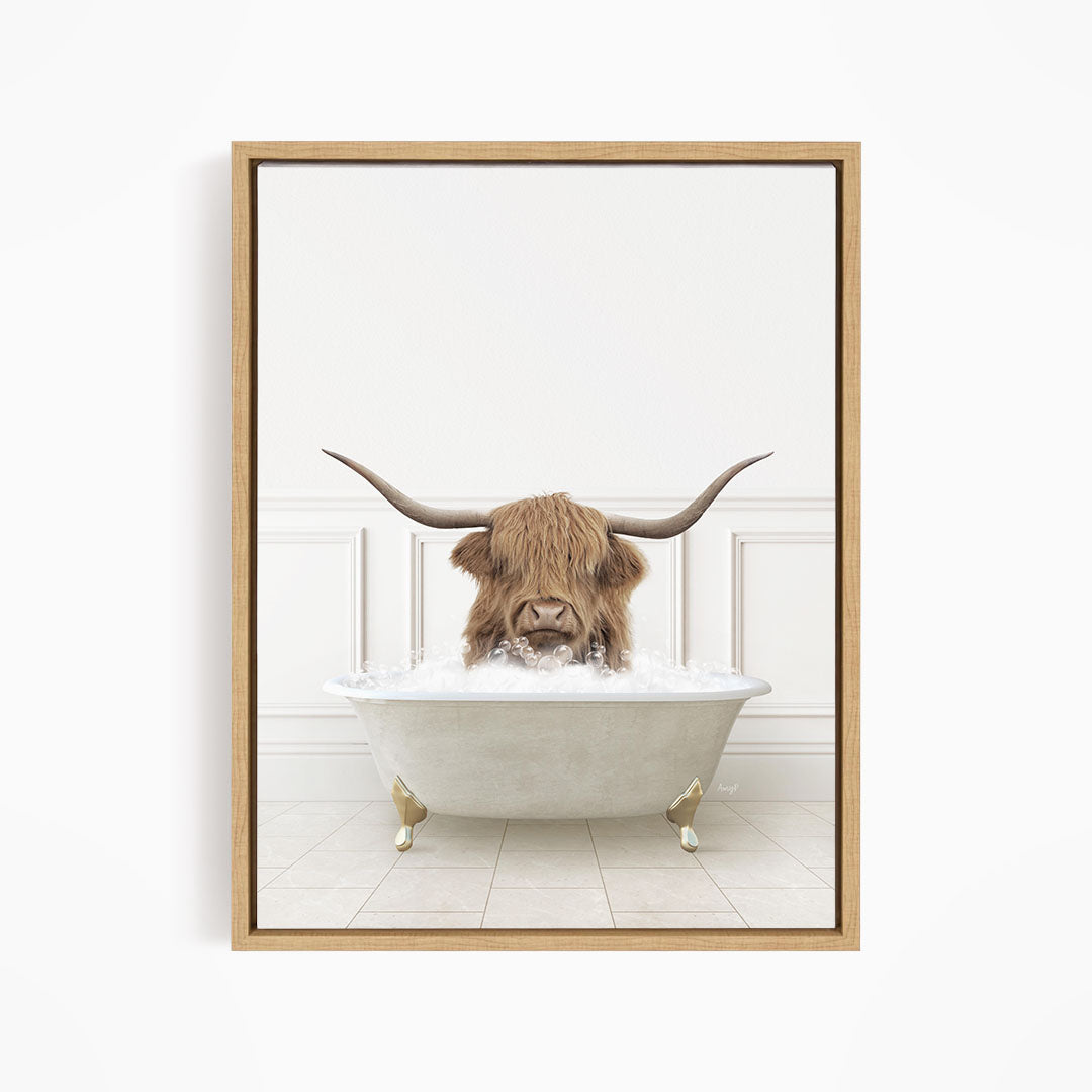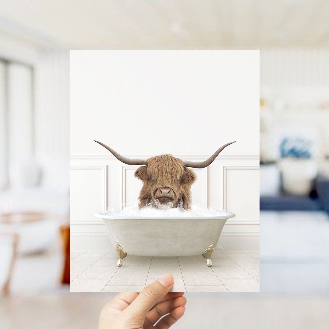 A hand holds up a framed image depicting a Highland cow with large horns sitting in a bathtub filled with water.